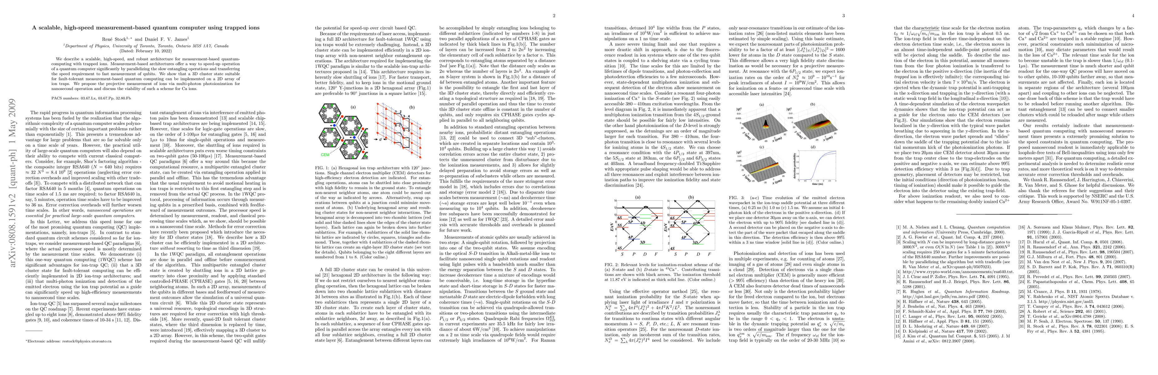 This paper proposes a scalable, high-speed architecture for measurement-based quantum computing using trapped ions, leveraging fast qubit measurement to parallelize operations. The authors suggest implementing a 3D cluster state on a 2D array of ion traps and propose multi-photon photoionization for nanosecond-scale projective measurements, specifically for Ca ions.