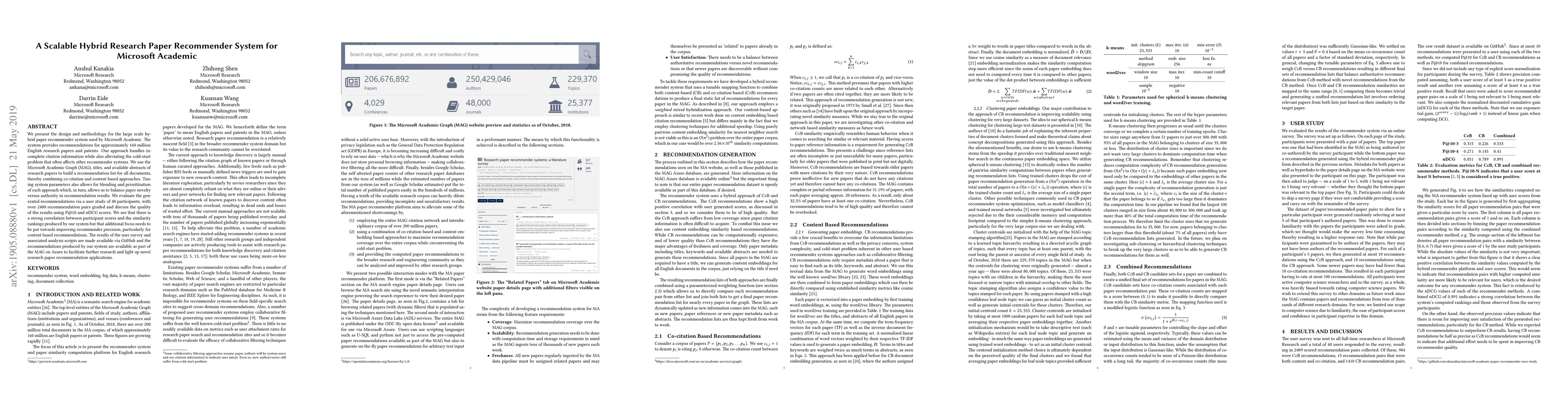 The paper details a scalable hybrid recommender system for Microsoft Academic, combining co-citation and content-based methods to recommend 160 million English research papers and patents. Evaluation via a user study indicates strong correlation between participant scores and system rankings, but highlights the need for precision improvements, especially in content-based recommendations.