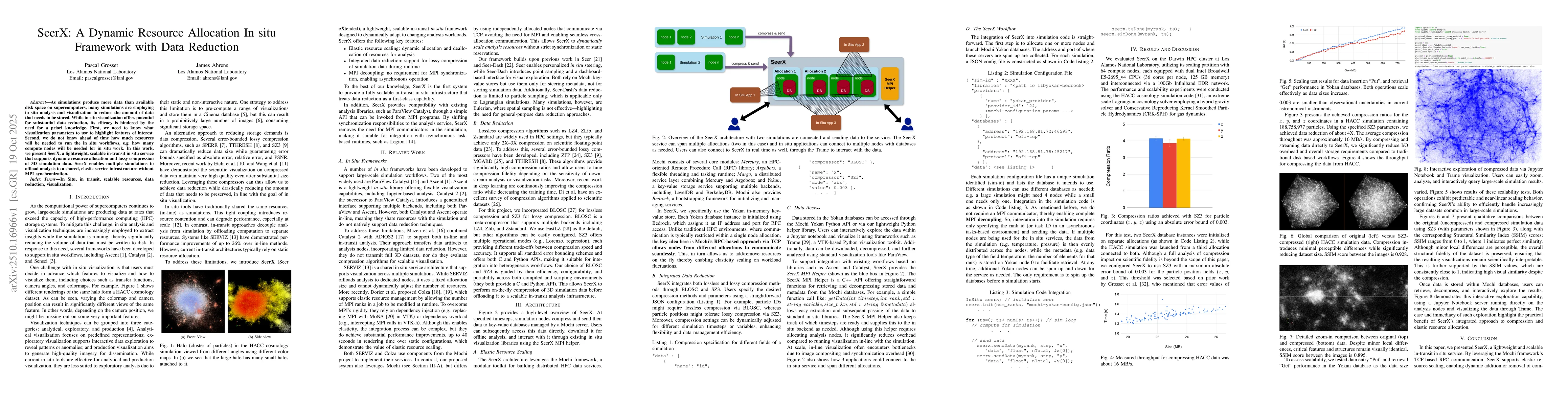 The paper presents SeerX, a scalable in-transit in situ service that dynamically allocates resources and applies lossy compression to 3D simulation data. It integrates with existing analysis libraries like ParaView Catalyst through an API and leverages the Mochi framework for distributed data services.