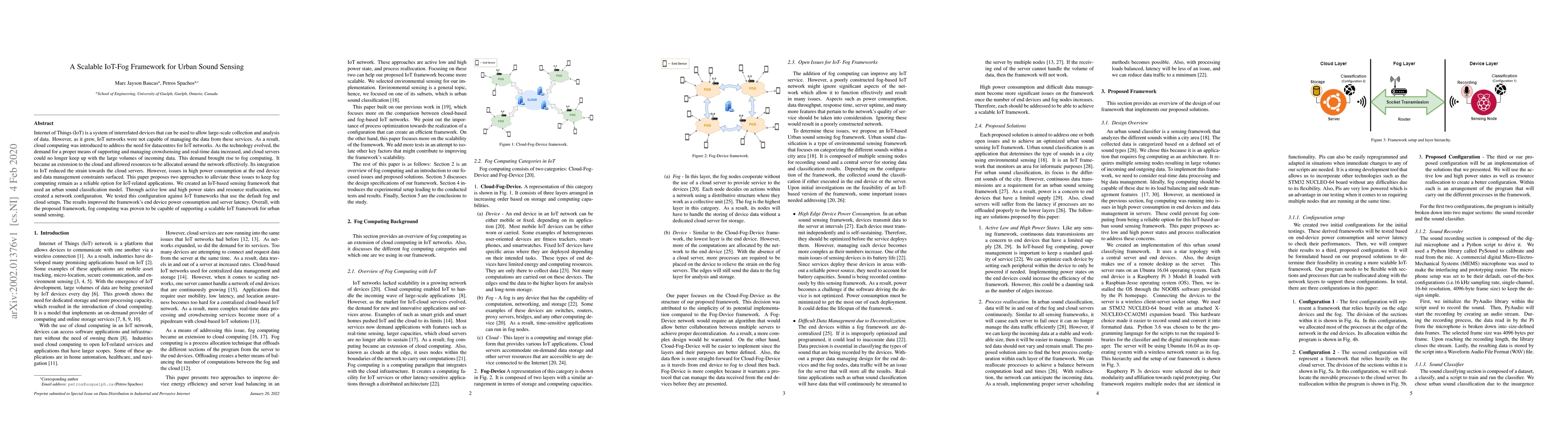 This paper proposes a scalable IoT-Fog framework to manage urban sound sensing, addressing high power consumption and data management issues. The framework uses active power states and resource reallocation, demonstrating improved end device power consumption and reduced server latency compared to traditional fog and cloud setups.