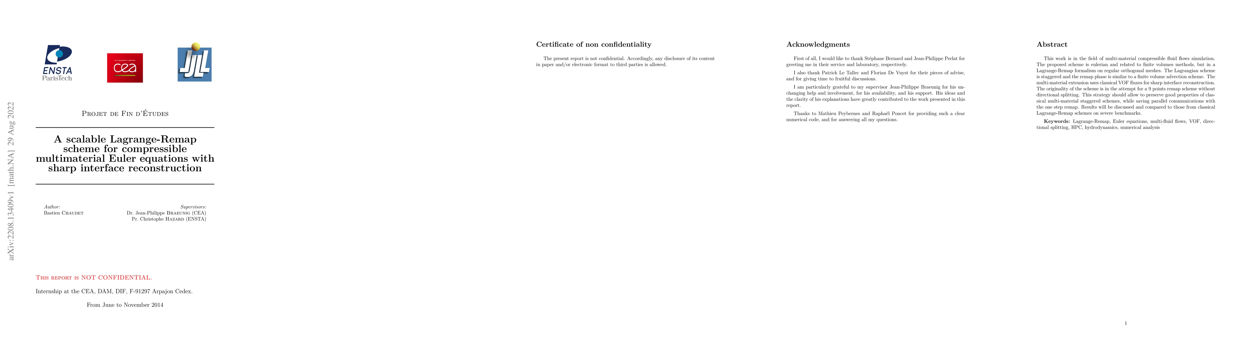 This paper proposes a scalable Lagrange-Remap scheme for simulating multi-material compressible fluid flows using a finite volume approach on regular orthogonal meshes. The scheme aims to preserve the benefits of classical staggered methods while reducing parallel communication through a non-directional 9-point remap.