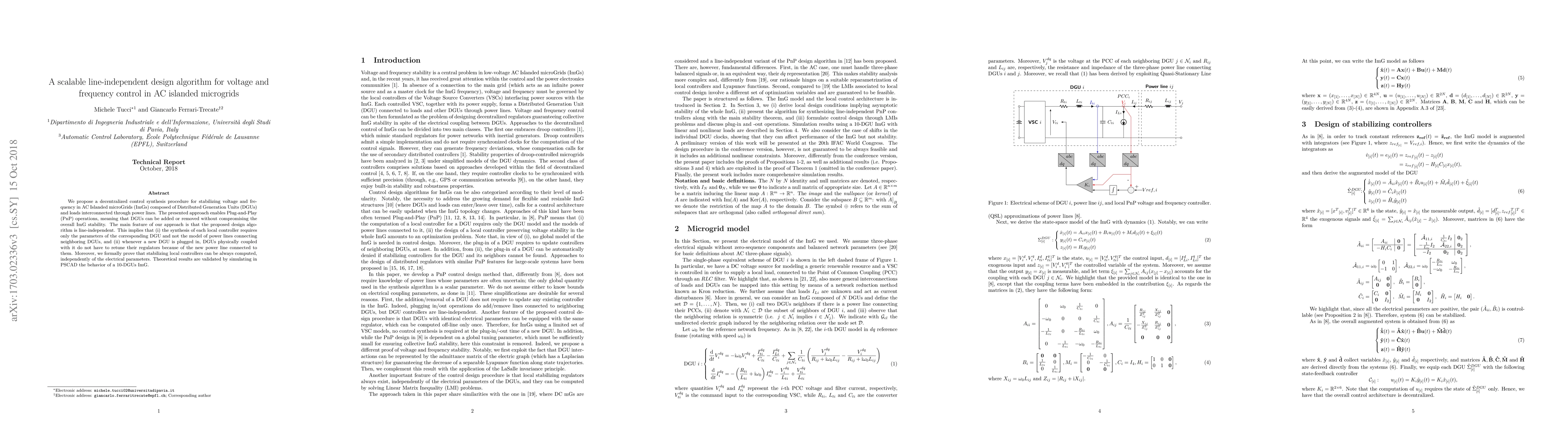 This paper introduces a decentralized control algorithm for stabilizing voltage and frequency in AC islanded microgrids, ensuring line-independent design that allows for Plug-and-Play operations without compromising stability. The algorithm's main feature is its independence from power line models, enabling seamless addition or removal of Distributed Generation Units without requiring retuning of existing controllers.