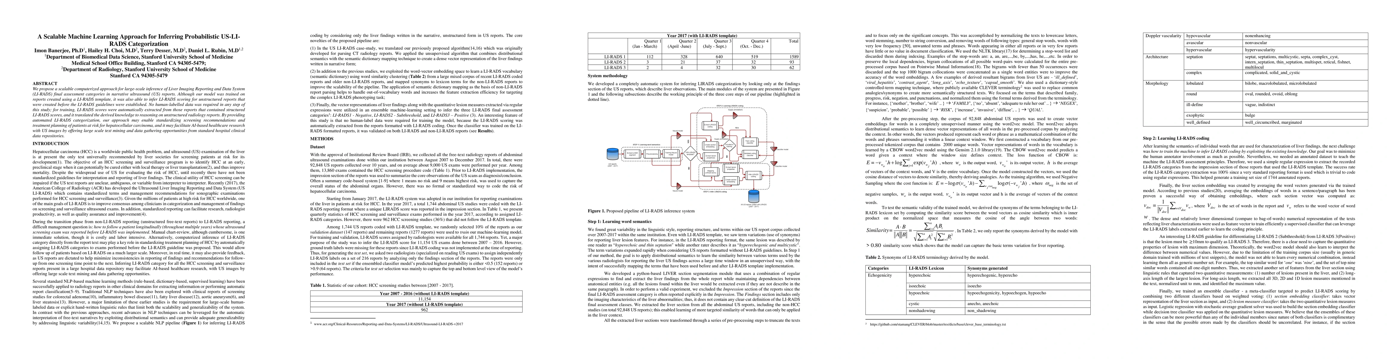 This paper proposes a scalable machine learning model to infer probabilistic Liver Imaging Reporting and Data System (LI-RADS) categories from ultrasound reports, including unstructured ones. The model was trained without human-labeled data, using automated extraction of LI-RADS scores from structured reports, and aims to standardize screening and treatment recommendations for hepatocellular carcinoma.