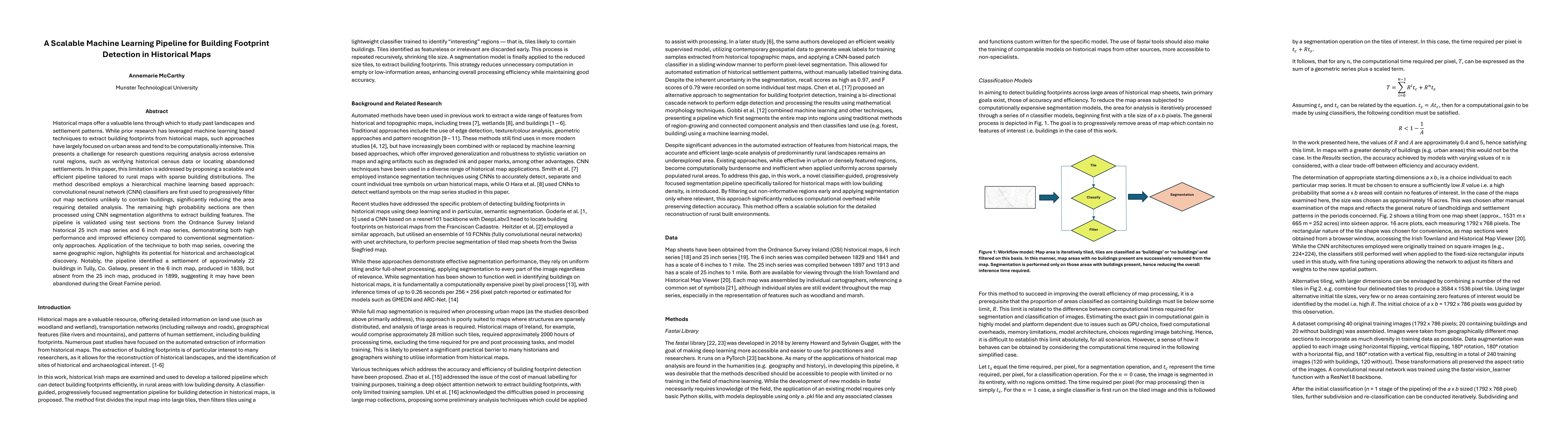 Historical maps offer a valuable lens through which to study past landscapes and settlement patterns. While prior research has leveraged machine learning based techniques to extract building footprints from historical maps, such approaches have largely focused on urban areas and tend to be computationally intensive. This presents a challenge for research questions requiring analysis across extensive rural regions, such as verifying historical census data or locating abandoned settlements. In this paper, this limitation is addressed by proposing a scalable and efficient pipeline tailored to rural maps with sparse building distributions. The method described employs a hierarchical machine learning based approach: convolutional neural network (CNN) classifiers are first used to progressively filter out map sections unlikely to contain buildings, significantly reducing the area requiring detailed analysis. The remaining high probability sections are then processed using CNN segmentation algorithms to extract building features. The pipeline is validated using test sections from the Ordnance Survey Ireland historical 25 inch map series and 6 inch map series, demonstrating both high performance and improved efficiency compared to conventional segmentation-only approaches. Application of the technique to both map series, covering the same geographic region, highlights its potential for historical and archaeological discovery. Notably, the pipeline identified a settlement of approximately 22 buildings in Tully, Co. Galway, present in the 6 inch map, produced in 1839, but absent from the 25 inch map, produced in 1899, suggesting it may have been abandoned during the Great Famine period.