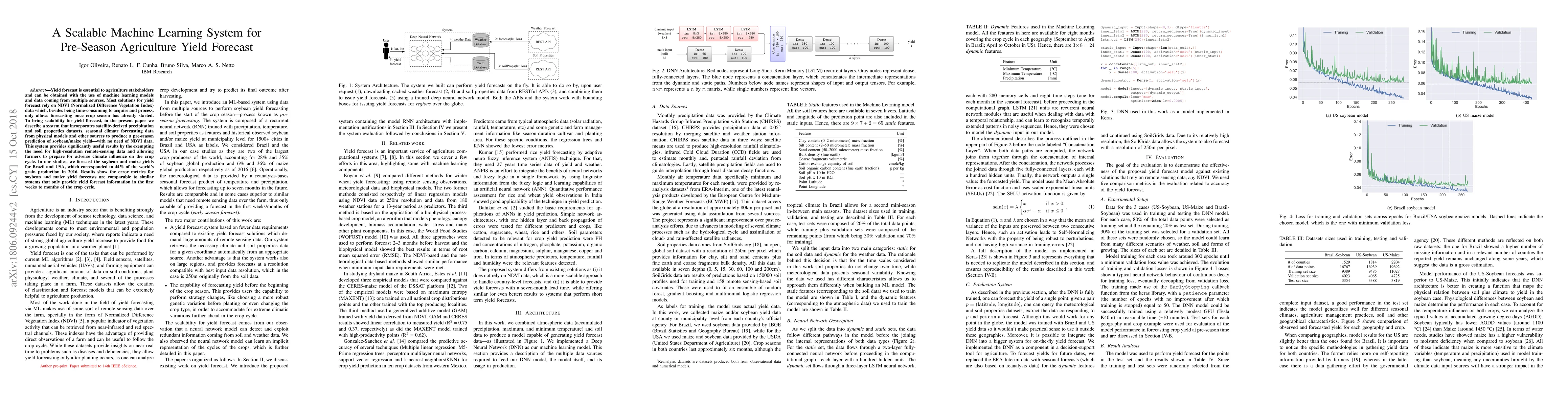 Yield forecast is essential to agriculture stakeholders and can be obtained with the use of machine learning models and data coming from multiple sources. Most solutions for yield forecast rely on NDVI (Normalized Difference Vegetation Index) data, which is time-consuming to be acquired and processed. To bring scalability for yield forecast, in the present paper we describe a system that incorporates satellite-derived precipitation and soil properties datasets, seasonal climate forecasting data from physical models and other sources to produce a pre-season prediction of soybean/maize yield---with no need of NDVI data. This system provides significantly useful results by the exempting the need for high-resolution remote-sensing data and allowing farmers to prepare for adverse climate influence on the crop cycle. In our studies, we forecast the soybean and maize yields for Brazil and USA, which corresponded to 44% of the world's grain production in 2016. Results show the error metrics for soybean and maize yield forecasts are comparable to similar systems that only provide yield forecast information in the first weeks to months of the crop cycle.