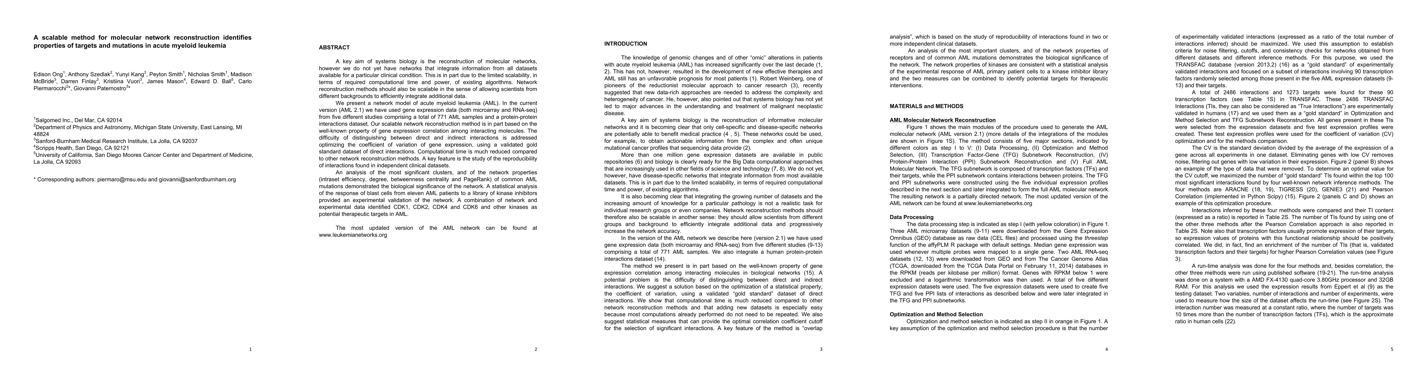 This paper presents a scalable method for reconstructing molecular networks in acute myeloid leukemia (AML), integrating gene expression and protein-protein interaction data from multiple studies. The method efficiently identifies significant network properties and mutations, validating potential therapeutic targets like CDK1, CDK2, CDK4, and CDK6 through experimental response analysis to kinase inhibitors.