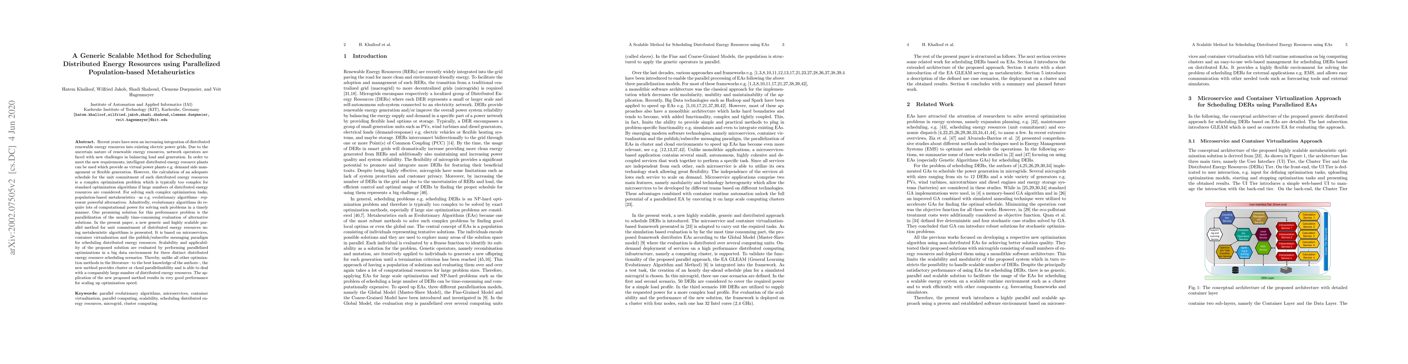 The paper presents a scalable method for scheduling Distributed Energy Resources (DERs) using parallelized population-based metaheuristics, specifically Evolutionary Algorithms (EAs), leveraging microservices, container virtualization, and publish/subscribe messaging paradigm.