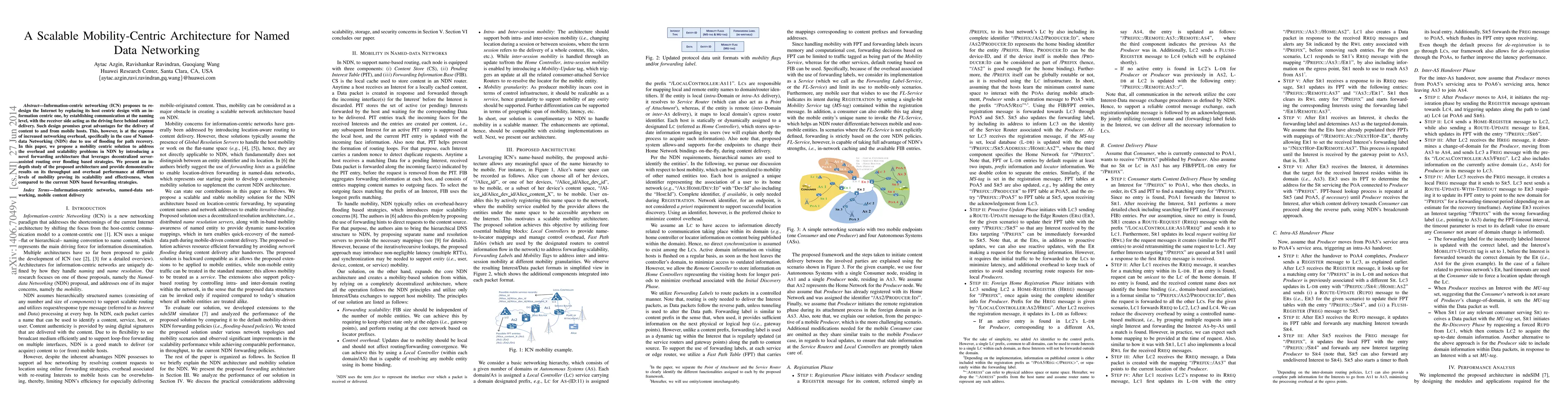 This paper proposes a scalable mobility-centric architecture for Named Data Networking (NDN) to address overhead and scalability issues. The new architecture leverages decentralized server-assisted routing over traditional flooding strategies, demonstrating improved throughput and reduced overhead in various mobility scenarios.