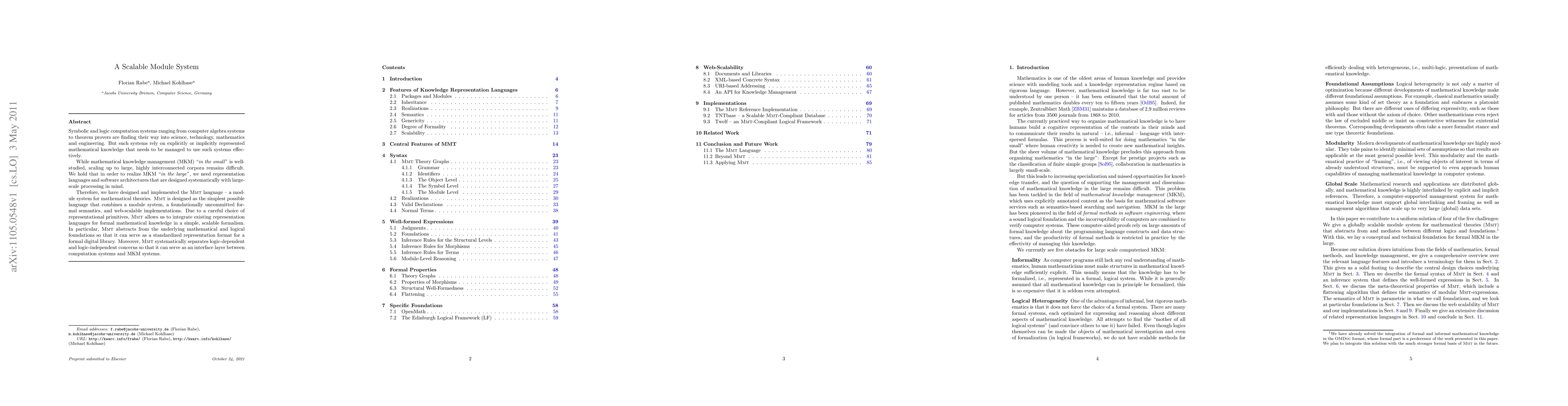 The paper introduces the MMT language, a scalable module system designed for managing large corpora of mathematical knowledge, aiming to standardize representation and facilitate integration of existing formal languages. It emphasizes the separation of logic-dependent and logic-independent concerns to serve as an interface layer between computation systems and mathematical knowledge management systems.