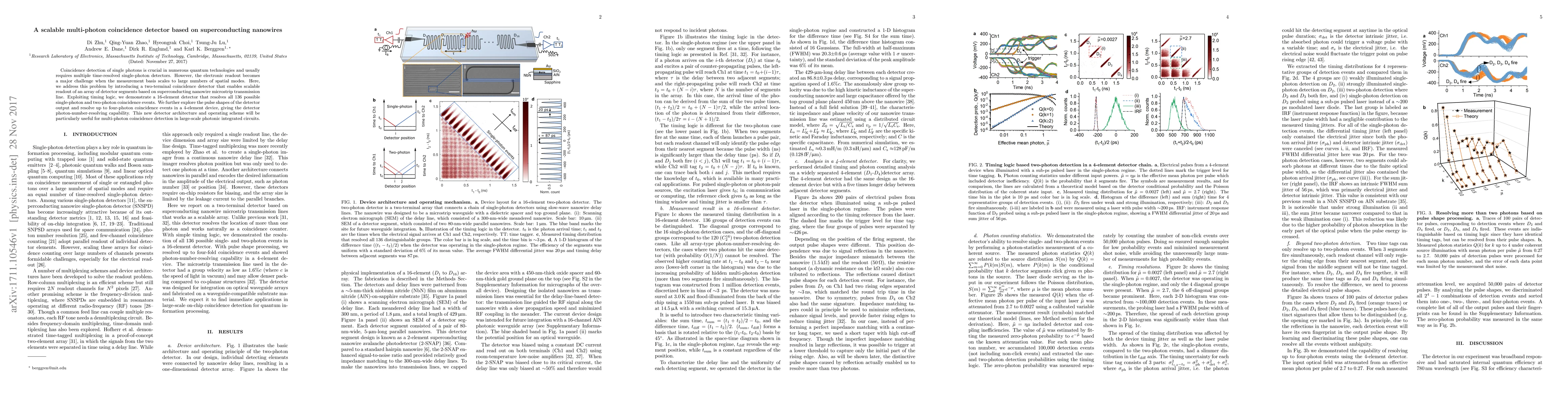 This paper introduces a scalable multi-photon coincidence detector based on superconducting nanowires, addressing the challenge of large-scale quantum technology readout. The proposed two-terminal detector resolves up to four-photon coincidence events and is demonstrated with a 16-element array, showing potential for use in photonic integrated circuits.
