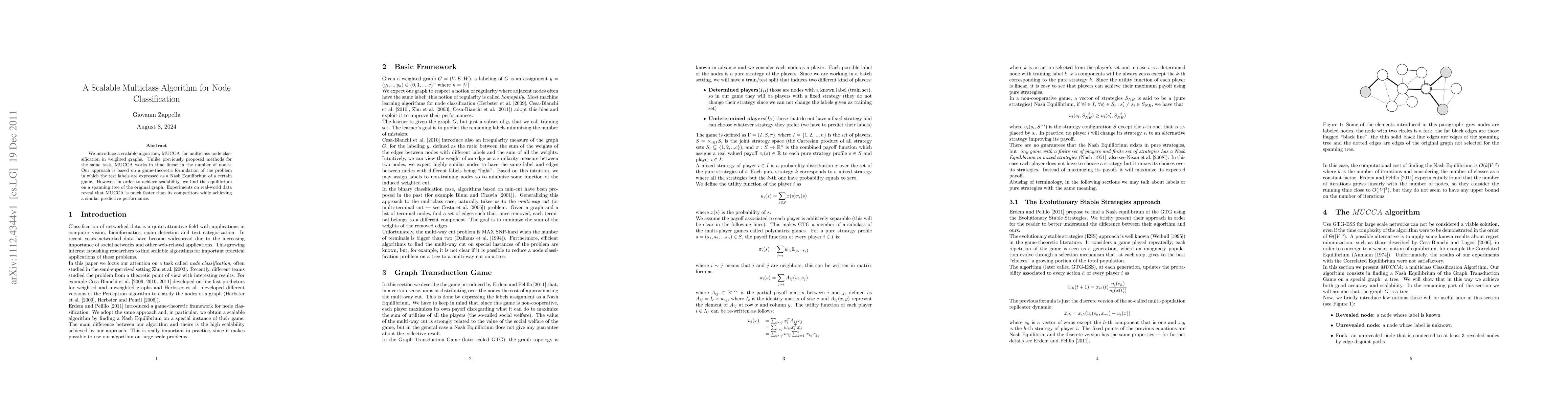 MUCCA is a scalable, linear-time algorithm for multiclass node classification in weighted graphs, employing a game-theoretic Nash Equilibrium approach on a spanning tree for efficiency. Experiments show it outperforms competitors in speed while maintaining comparable predictive accuracy.