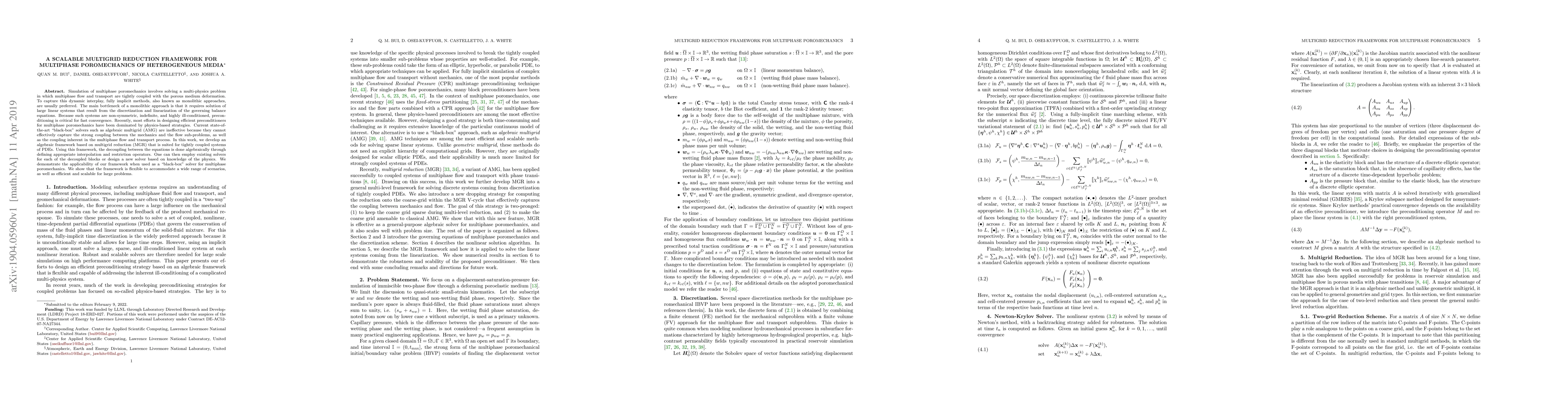 This paper presents a scalable multigrid reduction framework for solving multiphase poromechanics in heterogeneous media, addressing the challenges of large, non-symmetric, and ill-conditioned linear systems. The framework decouples the tightly coupled physics through algebraic methods, enabling efficient and scalable solutions for large-scale problems.