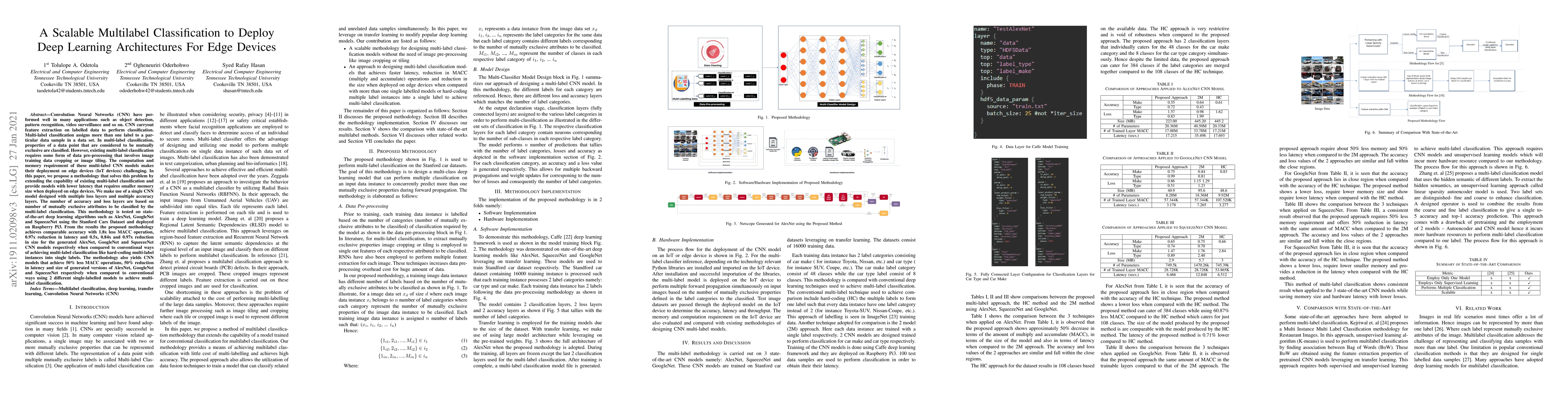 Convolution Neural Networks (CNN) have performed well in many applications such as object detection, pattern recognition, video surveillance and so on. CNN carryout feature extraction on labelled data to perform classification. Multi-label classification assigns more than one label to a particular data sample in a data set. In multi-label classification, properties of a data point that are considered to be mutually exclusive are classified. However, existing multi-label classification requires some form of data pre-processing that involves image training data cropping or image tiling. The computation and memory requirement of these multi-label CNN models makes their deployment on edge devices challenging. In this paper, we propose a methodology that solves this problem by extending the capability of existing multi-label classification and provide models with lower latency that requires smaller memory size when deployed on edge devices. We make use of a single CNN model designed with multiple loss layers and multiple accuracy layers. This methodology is tested on state-of-the-art deep learning algorithms such as AlexNet, GoogleNet and SqueezeNet using the Stanford Cars Dataset and deployed on Raspberry Pi3. From the results the proposed methodology achieves comparable accuracy with 1.8x less MACC operation, 0.97x reduction in latency and 0.5x, 0.84x and 0.97x reduction in size for the generated AlexNet, GoogleNet and SqueezeNet CNN models respectively when compared to conventional ways of achieving multi-label classification like hard-coding multi-label instances into single labels. The methodology also yields CNN models that achieve 50\% less MACC operations, 50% reduction in latency and size of generated versions of AlexNet, GoogleNet and SqueezeNet respectively when compared to conventional ways using 2 different single-labelled models to achieve multi-label classification.
