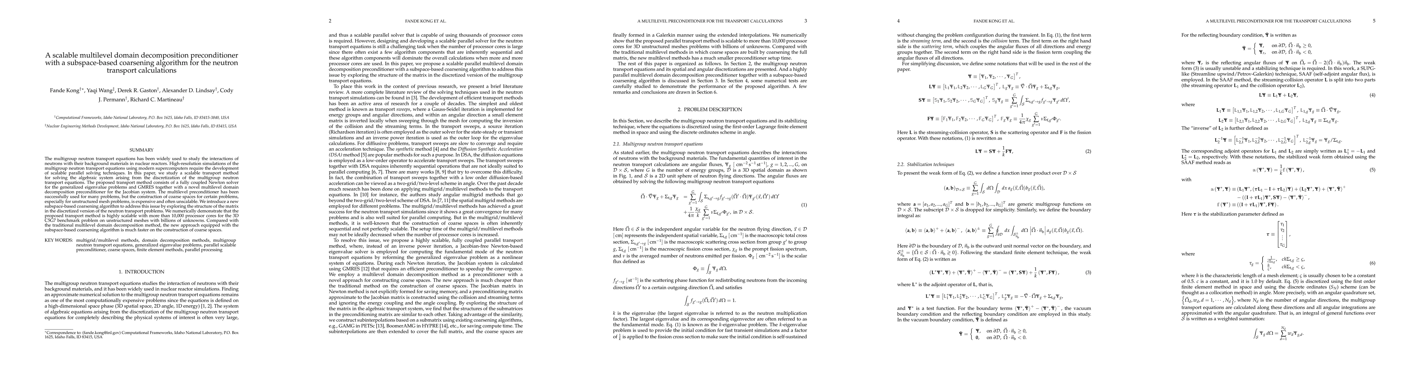 This paper proposes a scalable multilevel domain decomposition preconditioner with a novel subspace-based coarsening algorithm for solving high-resolution neutron transport calculations. The new method demonstrates significant scalability and efficiency, especially on unstructured meshes, outperforming traditional methods.