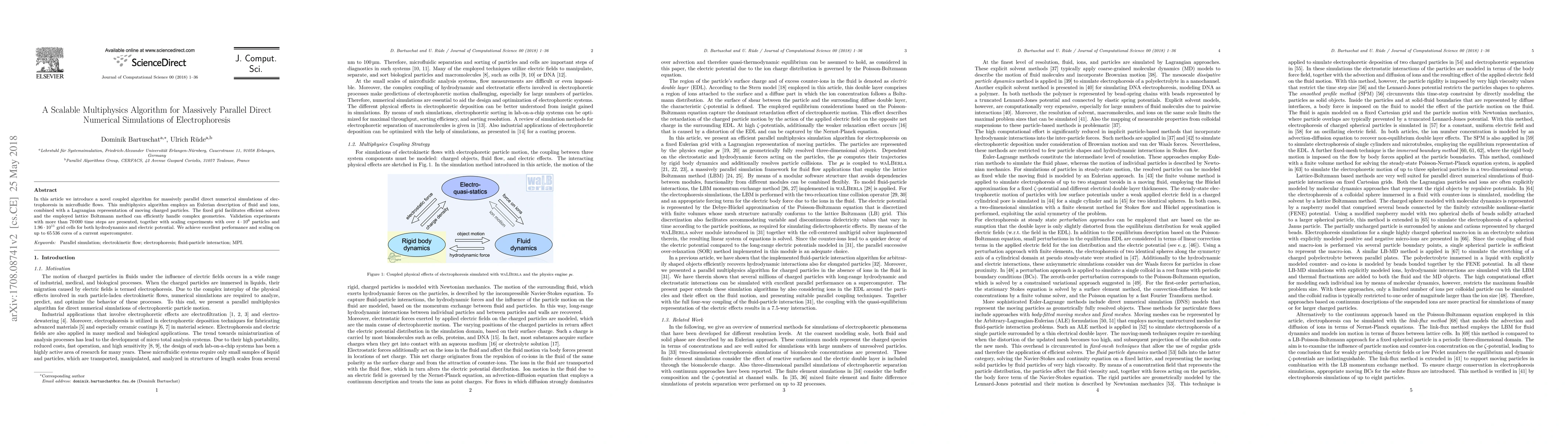 This paper presents a scalable multiphysics algorithm for massively parallel simulations of electrophoresis in microfluidic flows, combining Eulerian fluid and ion descriptions with a Lagrangian approach for charged particles. The lattice Boltzmann method efficiently handles complex geometries, demonstrating excellent performance on up to 65,536 cores of a supercomputer.