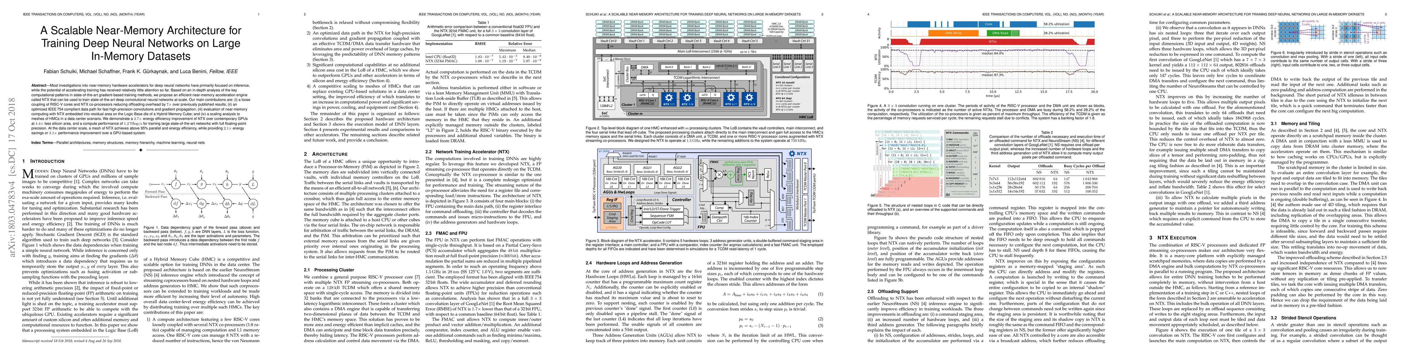 This paper proposes NTX, a scalable near-memory architecture to accelerate training of deep neural networks on large in-memory datasets. It achieves a 2.7x energy efficiency improvement over GPUs while using 4.4x less silicon area, demonstrating 1.2 Tflop/s compute performance for training large networks.