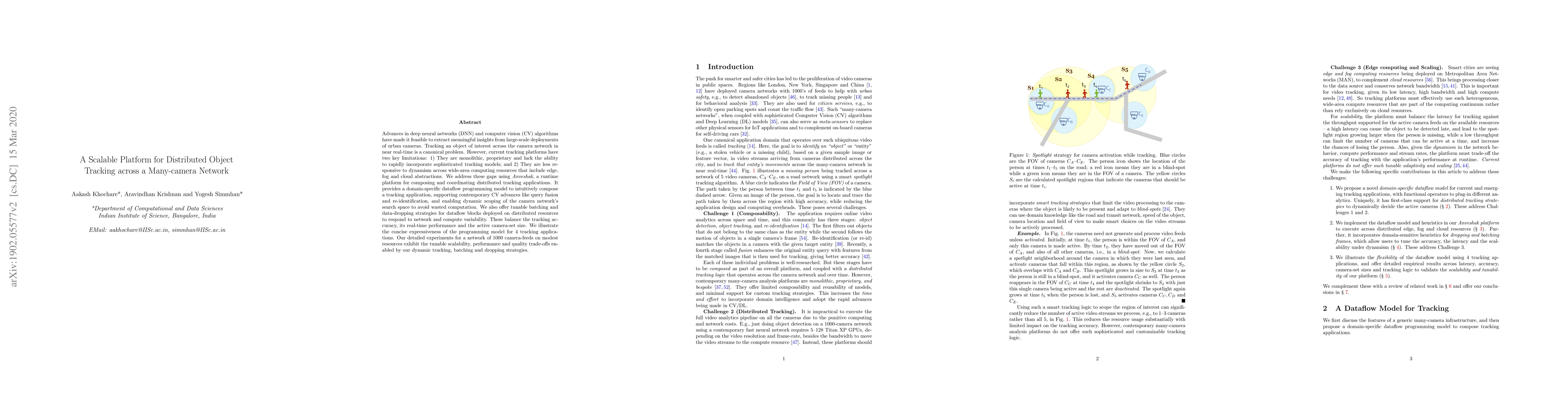 This paper introduces Anveshak, a scalable platform for distributed object tracking across many urban cameras, addressing limitations of existing monolithic and proprietary tracking systems. It enables dynamic adaptation to network and compute variability through a dataflow programming model, supporting advanced computer vision techniques and demonstrating scalability and performance on a network of 1000 camera feeds.