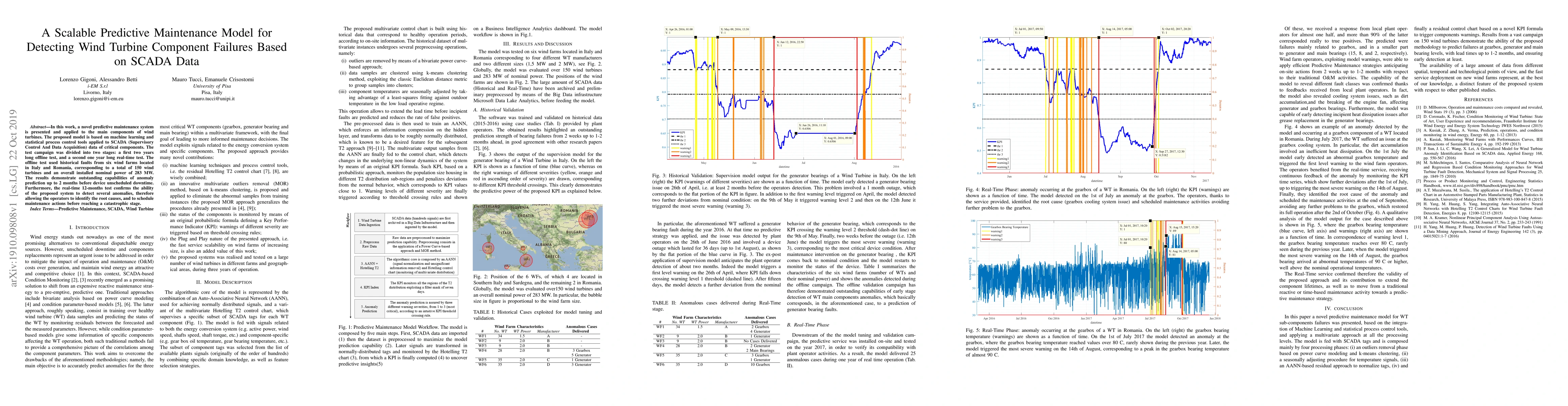 A predictive maintenance model using machine learning and statistical process control detects wind turbine component failures up to 2 months in advance, improving unscheduled downtime and maintenance scheduling.