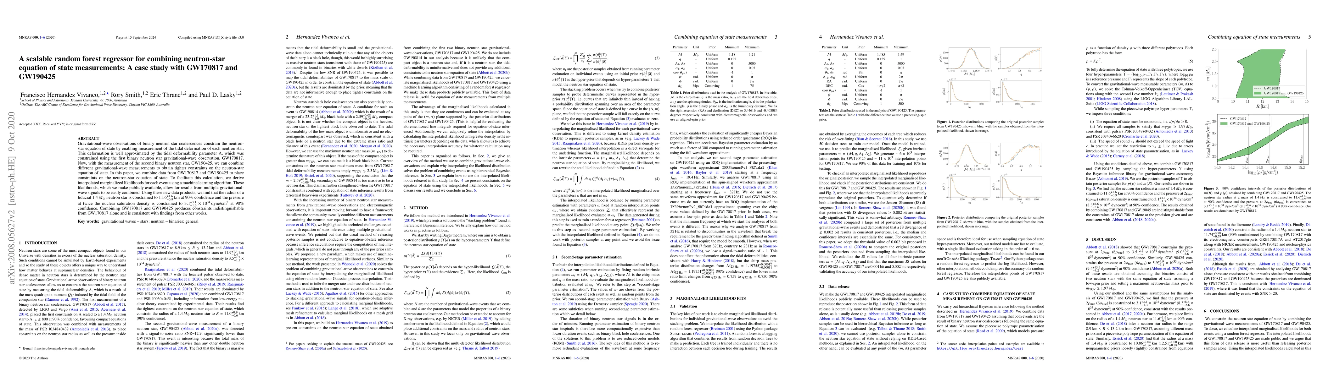 This paper employs a scalable random forest regressor to combine neutron-star equation of state measurements from gravitational-wave observations GW170817 and GW190425, yielding tighter constraints on neutron-star properties, specifically a radius of 11.6^{+1.6}_{-0.9} km at 90% confidence.