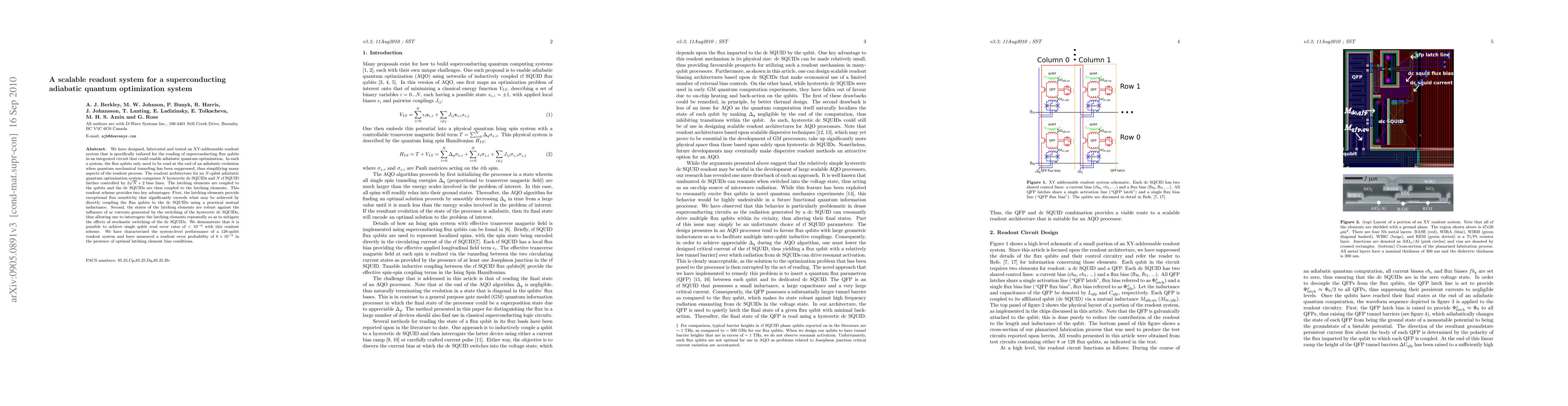 This paper presents a scalable readout system for superconducting flux qubits in an adiabatic quantum optimization system, utilizing XY-addressable readout with hysteretic dc SQUIDs and rf SQUID latches. The design achieves high flux sensitivity and robust state interrogation, demonstrating single qubit read error rates below $10^{-6}$ and a system-level error probability of $8\times10^{-5}$ for a 128-qubit setup.