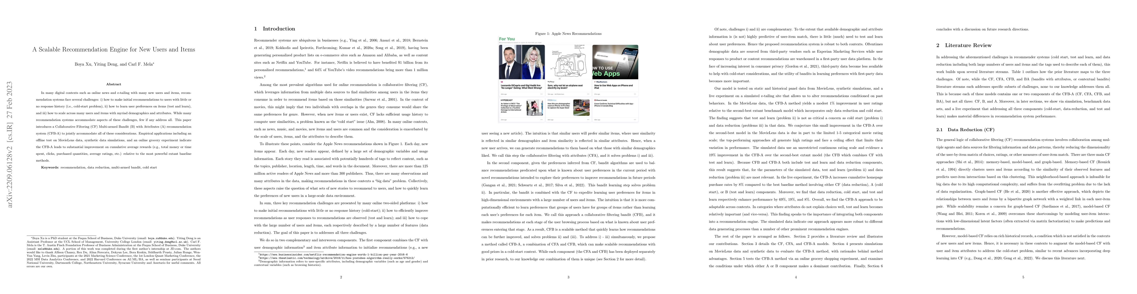 In many digital contexts such as online news and e-tailing with many new users and items, recommendation systems face several challenges: i) how to make initial recommendations to users with little or no response history (i.e., cold-start problem), ii) how to learn user preferences on items (test and learn), and iii) how to scale across many users and items with myriad demographics and attributes. While many recommendation systems accommodate aspects of these challenges, few if any address all. This paper introduces a Collaborative Filtering (CF) Multi-armed Bandit (B) with Attributes (A) recommendation system (CFB-A) to jointly accommodate all of these considerations. Empirical applications including an offline test on MovieLens data, synthetic data simulations, and an online grocery experiment indicate the CFB-A leads to substantial improvement on cumulative average rewards (e.g., total money or time spent, clicks, purchased quantities, average ratings, etc.) relative to the most powerful extant baseline methods.