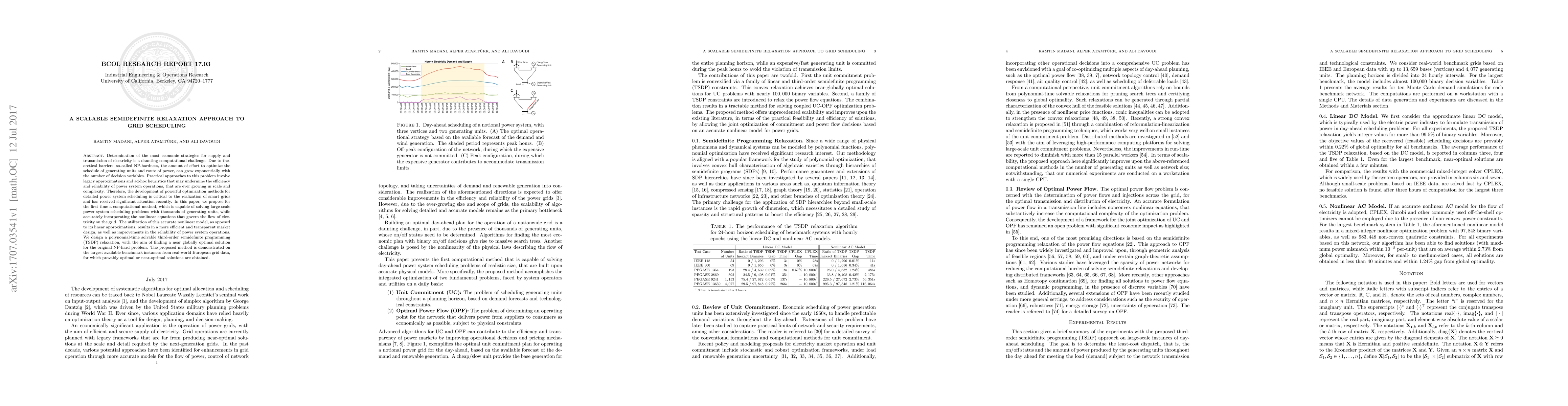 Determination of the most economic strategies for supply and transmission of electricity is a daunting computational challenge. Due to theoretical barriers, so-called NP-hardness, the amount of effort to optimize the schedule of generating units and route of power, can grow exponentially with the number of decision variables. Practical approaches to this problem involve legacy approximations and ad-hoc heuristics that may undermine the efficiency and reliability of power system operations, that are ever growing in scale and complexity. Therefore, the development of powerful optimization methods for detailed power system scheduling is critical to the realization of smart grids and has received significant attention recently. In this paper, we propose for the first time a computational method, which is capable of solving large-scale power system scheduling problems with thousands of generating units, while accurately incorporating the nonlinear equations that govern the flow of electricity on the grid. The utilization of this accurate nonlinear model, as opposed to its linear approximations, results in a more efficient and transparent market design, as well as improvements in the reliability of power system operations. We design a polynomial-time solvable third-order semidefinite programming (TSDP) relaxation, with the aim of finding a near globally optimal solution for the original NP-hard problem. The proposed method is demonstrated on the largest available benchmark instances from real-world European grid data, for which provably optimal or near-optimal solutions are obtained.