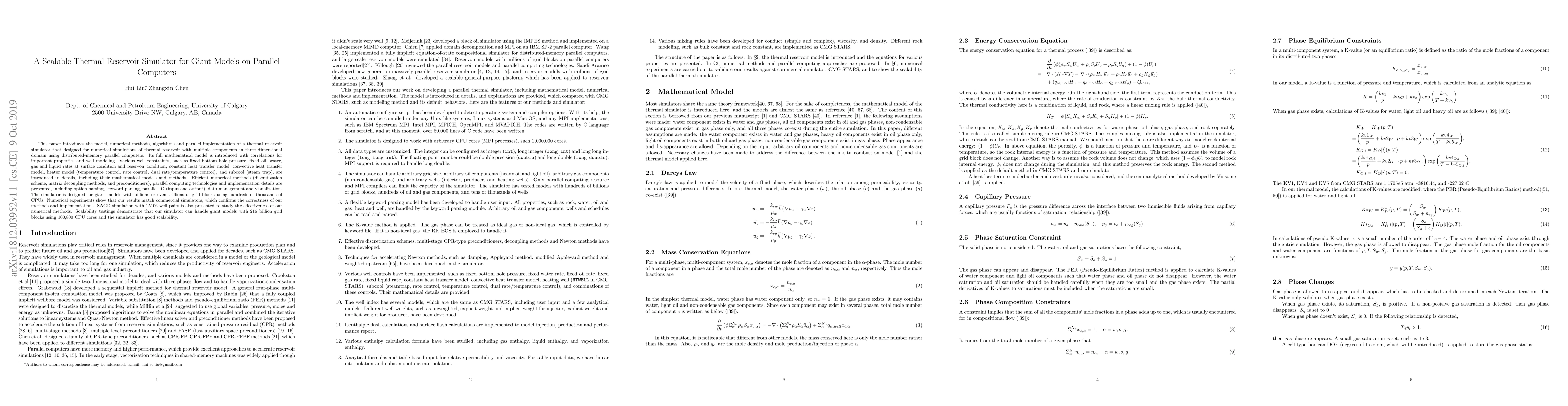 This paper introduces the model, numerical methods, algorithms and parallel implementation of a thermal reservoir simulator that designed for numerical simulations of thermal reservoir with multiple components in three dimensional domain using distributed-memory parallel computers. Its full mathematical model is introduced with correlations for important properties and well modeling. Various well constraints, such as fixed bottom hole pressure, fixed oil, water, gas and liquid rates, constant heat transfer model, convective heat transfer model, heater model (temperature control, rate control, dual rate/temperature control), and subcool (steam trap), are introduced in details, including their mathematical models and methods. Efficient numerical methods and parallel computing technologies are presented. The simulator is designed for giant models with billions or even trillions of grid blocks using hundreds of thousands of CPUs. Numerical experiments show that our results match commercial simulators, which confirms the correctness of our methods and implementations. SAGD simulation with 15106 well pairs is also presented to study the effectiveness of our numerical methods. Scalability testings demonstrate that our simulator can handle giant models with over 200 billion grid blocks using 100,800 CPU cores and the simulator has good scalability.