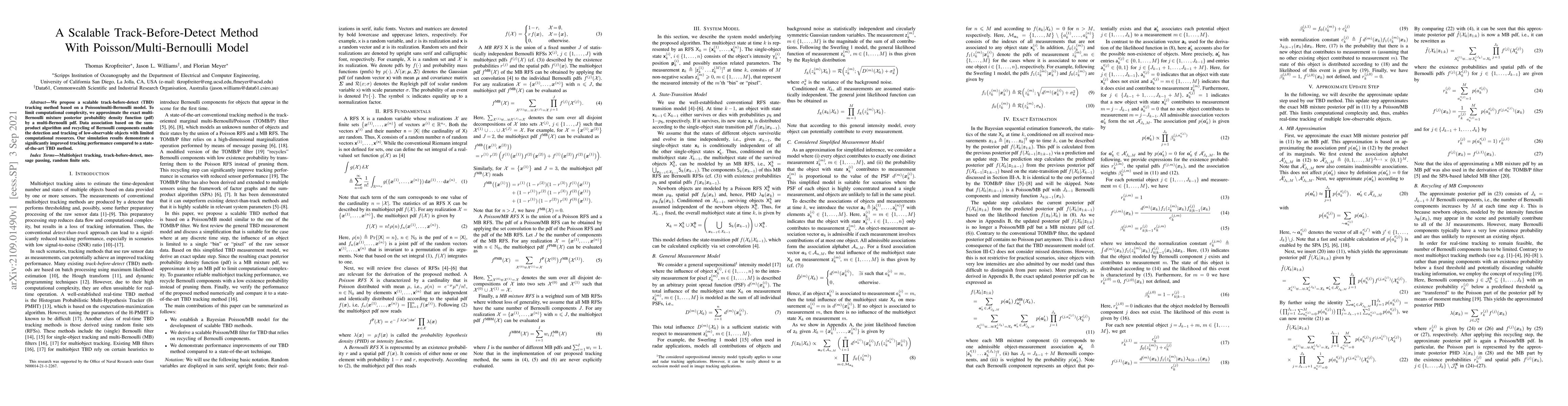 This paper proposes a scalable track-before-detect (TBD) method using a Poisson/multi-Bernoulli model to enhance tracking performance for low-observable objects. The method approximates the exact posterior probability density function to manage computational complexity, achieving better results than existing TBD techniques.