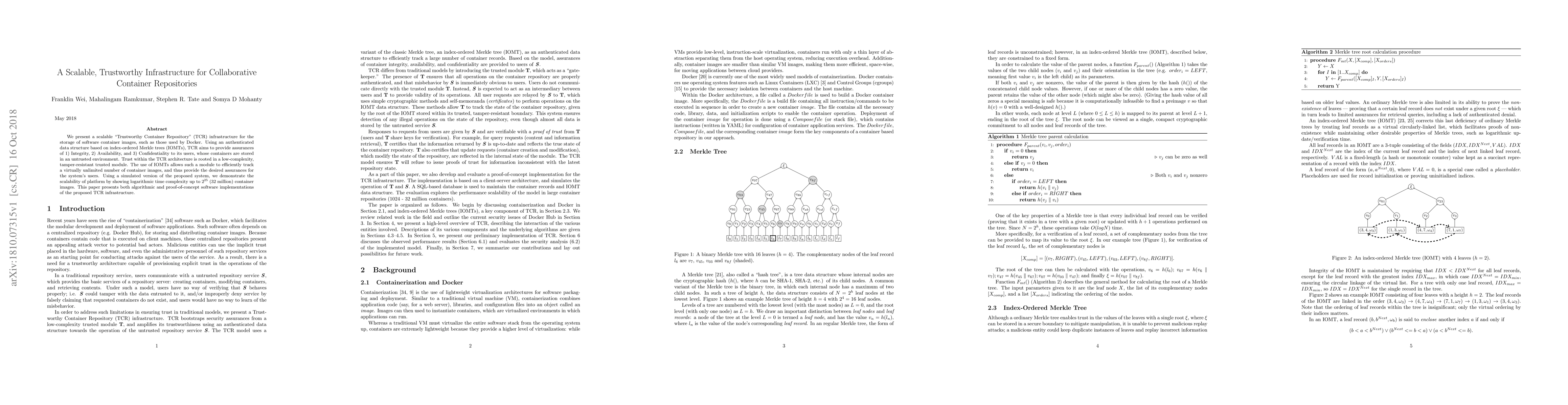 We present a scalable "Trustworthy Container Repository" (TCR) infrastructure for the storage of software container images, such as those used by Docker. Using an authenticated data structure based on index-ordered Merkle trees (IOMTs), TCR aims to provide assurances of 1) Integrity, 2) Availability, and 3) Confidentiality to its users, whose containers are stored in an untrusted environment. Trust within the TCR architecture is rooted in a low-complexity, tamper-resistant trusted module. The use of IOMTs allows such a module to efficiently track a virtually unlimited number of container images, and thus provide the desired assurances for the system's users. Using a simulated version of the proposed system, we demonstrate the scalability of platform by showing logarithmic time complexity up to $2^{25}$ (32 million) container images. This paper presents both algorithmic and proof-of-concept software implementations of the proposed TCR infrastructure.
