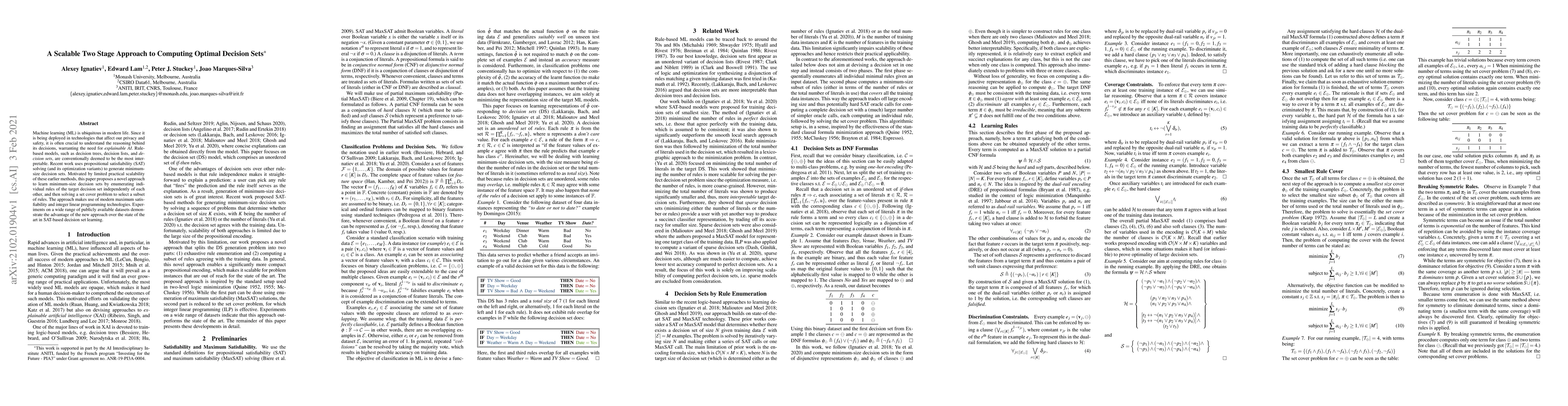 This paper introduces a scalable two-stage method for computing optimal decision sets using modern maximum satisfiability and integer linear programming. The approach independently enumerates rules and employs a set cover problem to select the minimum-size decision set, outperforming existing SAT-based methods on various datasets.