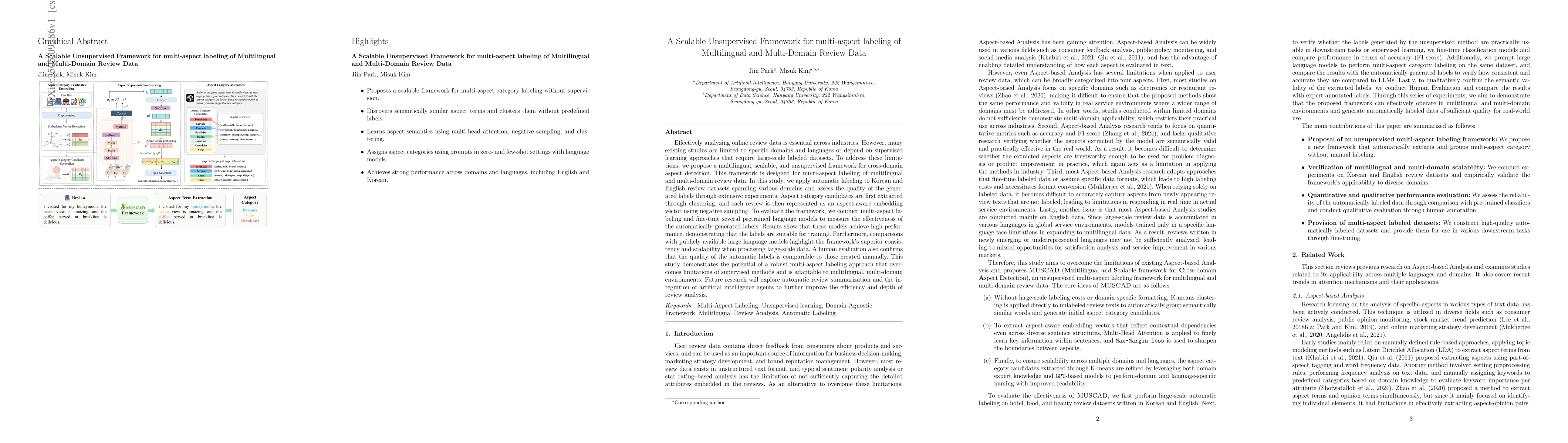 This research introduces a scalable, unsupervised framework for multi-aspect labeling of multilingual and multi-domain review data, overcoming supervised learning limitations. Experiments on Korean and English datasets show high-performing pretrained language models with automatically generated labels, comparable to manual labeling, and highlight the framework's consistency and scalability.