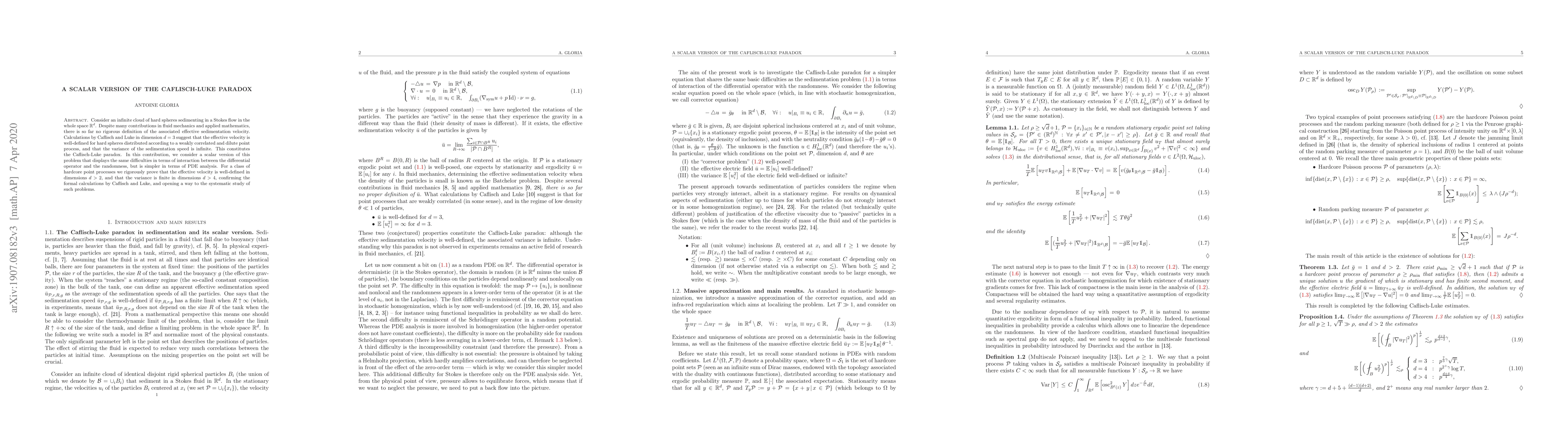Consider an infinite cloud of hard spheres sedimenting in a Stokes flow in the whole space $\mathbb R^d$. Despite many contributions in fluid mechanics and applied mathematics, there is so far no rigorous definition of the associated effective sedimentation velocity. Calculations by Caflisch and Luke in dimension $d=3$ suggest that the effective velocity is well-defined for hard spheres distributed according to a weakly correlated and dilute point process, and that the variance of the sedimentation speed is infinite. This constitutes the Caflisch-Luke paradox. In this contribution, we consider a scalar version of this problem that displays the same difficulties in terms of interaction between the differential operator and the randomness, but is simpler in terms of PDE analysis. For a class of hardcore point processes we rigorously prove that the effective velocity is well-defined in dimensions $d>2$, and that the variance is finite in dimensions $d>4$, confirming the formal calculations by Caflisch and Luke, and opening a way to the systematic study of such problems.