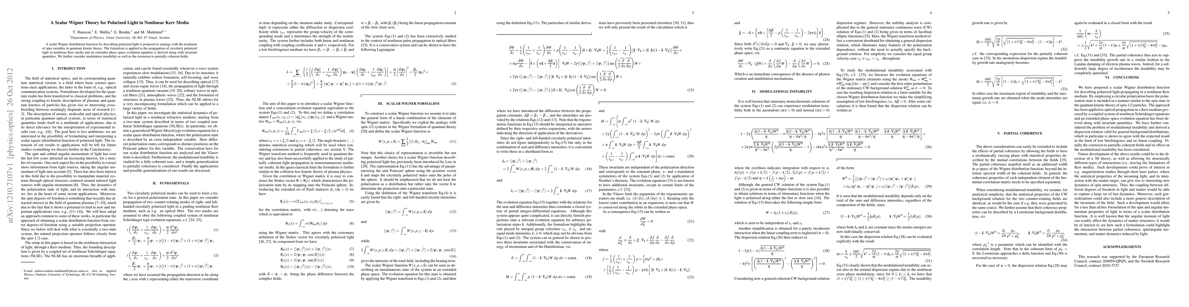 This paper proposes a scalar Wigner theory for polarized light, analogous to quantum kinetic theory, and applies it to nonlinear Kerr media, deriving an extended phase space evolution equation and invariant quantities. It also examines modulation instability and extends the theory to partially coherent fields.