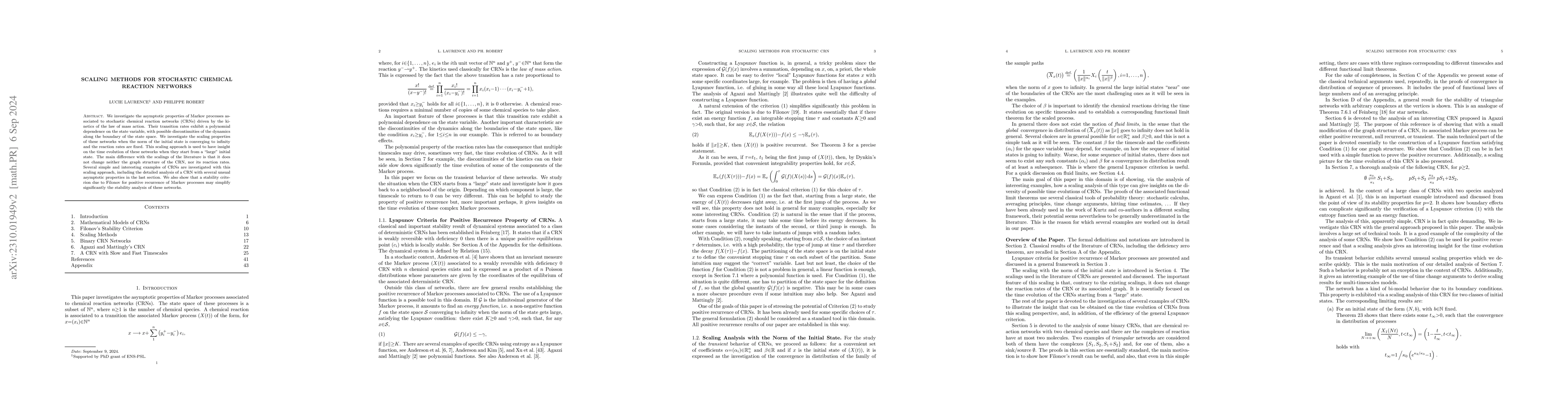 This paper explores the asymptotic properties of stochastic chemical reaction networks using a scaling approach based on the norm of the initial state, which preserves network topology and reaction constants. It demonstrates functional limit theorems to prove positive recurrence and provides insights into transient behavior and multiple time scales, along with general stability criteria and analyses of simple examples.