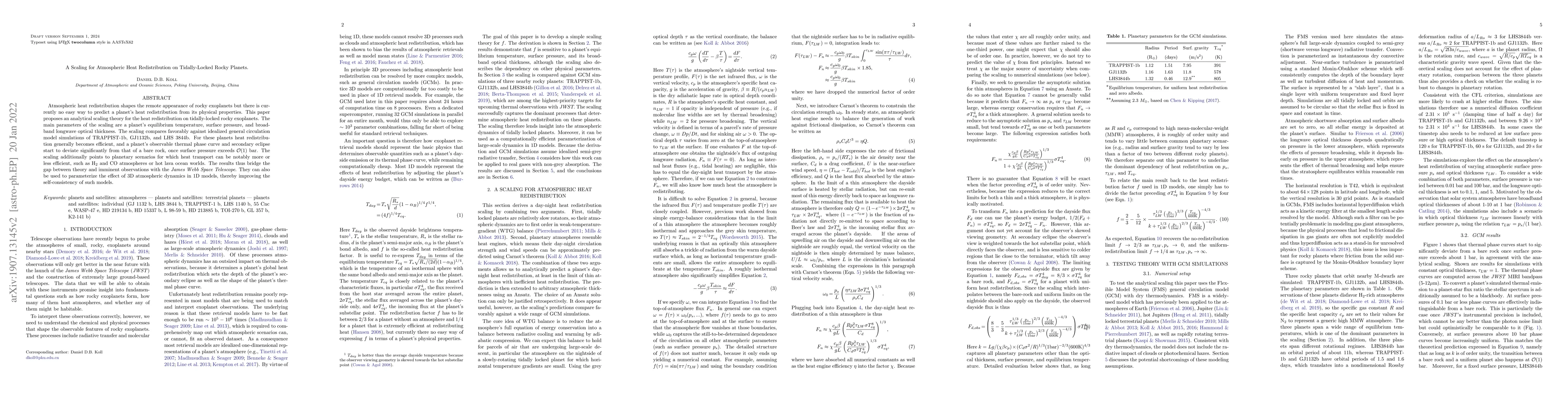 This paper introduces an analytical scaling theory for predicting atmospheric heat redistribution on tidally-locked rocky exoplanets, using parameters like equilibrium temperature and surface pressure. The theory aligns well with simulations of specific exoplanets and aids in understanding the thermal phase curves, bridging the gap between theoretical models and future observations.