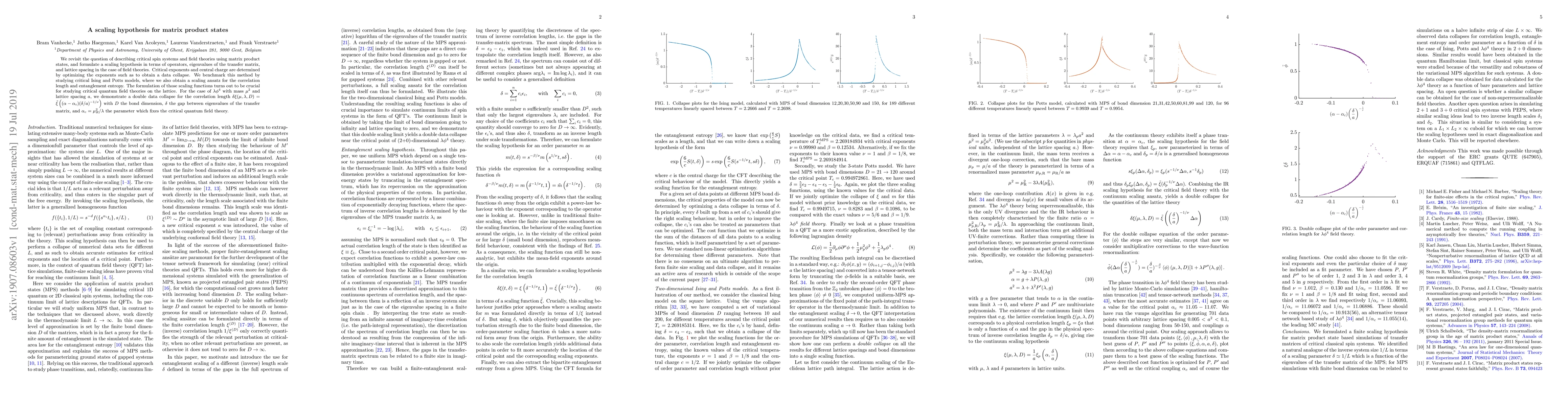 We revisit the question of describing critical spin systems and field theories using matrix product states, and formulate a scaling hypothesis in terms of operators, eigenvalues of the transfer matrix, and lattice spacing in the case of field theories. Critical exponents and central charge are determined by optimizing the exponents such as to obtain a data collapse. We benchmark this method by studying critical Ising and Potts models, where we also obtain a scaling ansatz for the correlation length and entanglement entropy. The formulation of those scaling functions turns out to be crucial for studying critical quantum field theories on the lattice. For the case of $\lambda\phi^4$ with mass $\mu^2$ and lattice spacing $a$, we demonstrate a double data collapse for the correlation length $ \delta \xi(\mu,\lambda,D)=\tilde{\xi} \left((\alpha-\alpha_c)(\delta/a)^{-1/\nu}\right)$ with $D$ the bond dimension, $\delta$ the gap between eigenvalues of the transfer matrix, and $\alpha_c=\mu_R^2/\lambda$ the parameter which fixes the critical quantum field theory.
