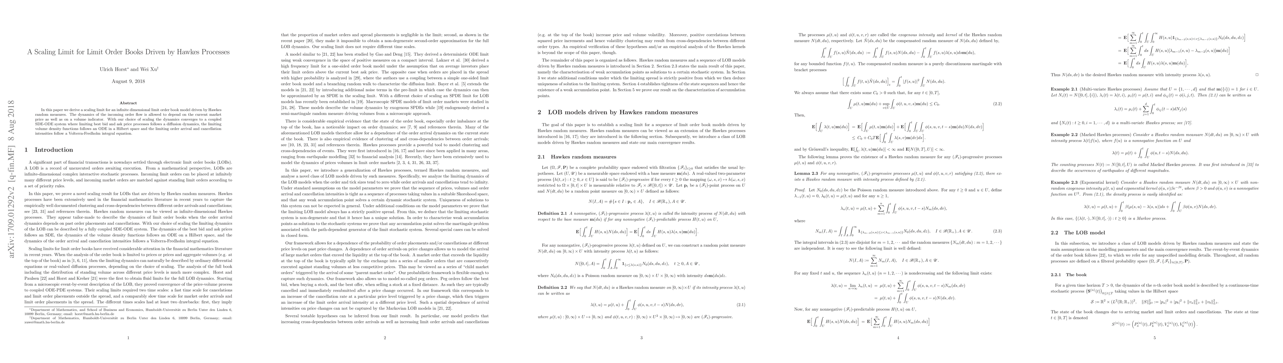 Researchers derive a scaling limit for an infinite-dimensional model of limit order books driven by Hawkes processes, revealing dynamics that converge to coupled SDE-ODE systems with diffusion best bid and ask prices and ODE-based volume density functions.