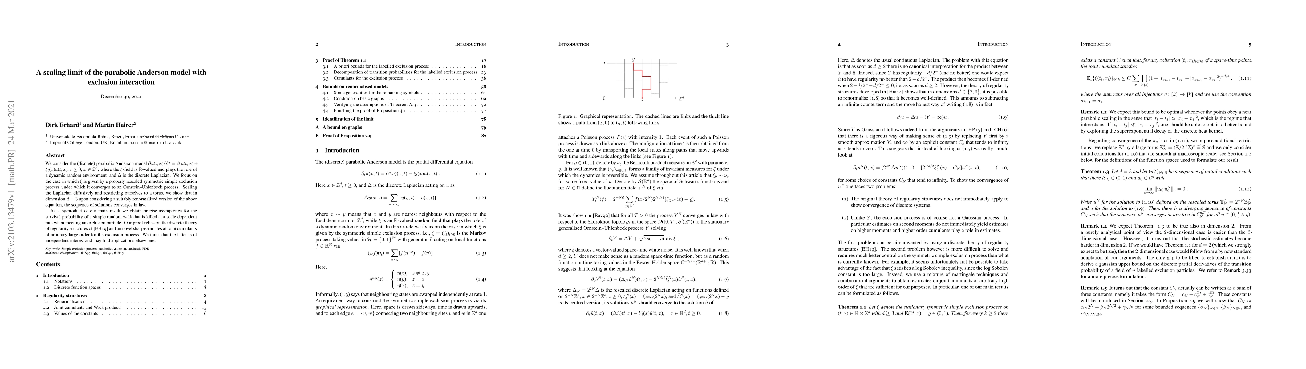 This paper studies the scaling limit of the parabolic Anderson model with a dynamic random environment given by a rescaled symmetric simple exclusion process, showing convergence to an Ornstein-Uhlenbeck process in dimension $d=3$. It also provides precise asymptotics for the survival probability of a simple random walk in the presence of exclusion particles.