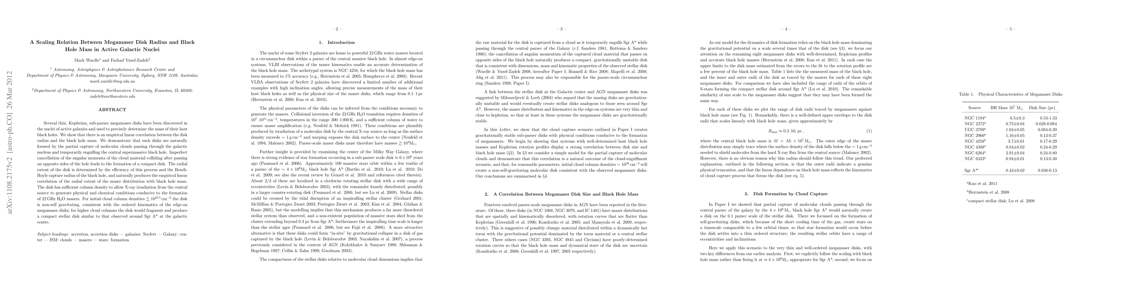 This paper establishes a linear correlation between the radius of megamaser disks in active galactic nuclei and the mass of their central black holes, suggesting these disks form from partially captured molecular clouds. The disk's radial extent is influenced by the angular momentum cancellation and the black hole's capture radius.