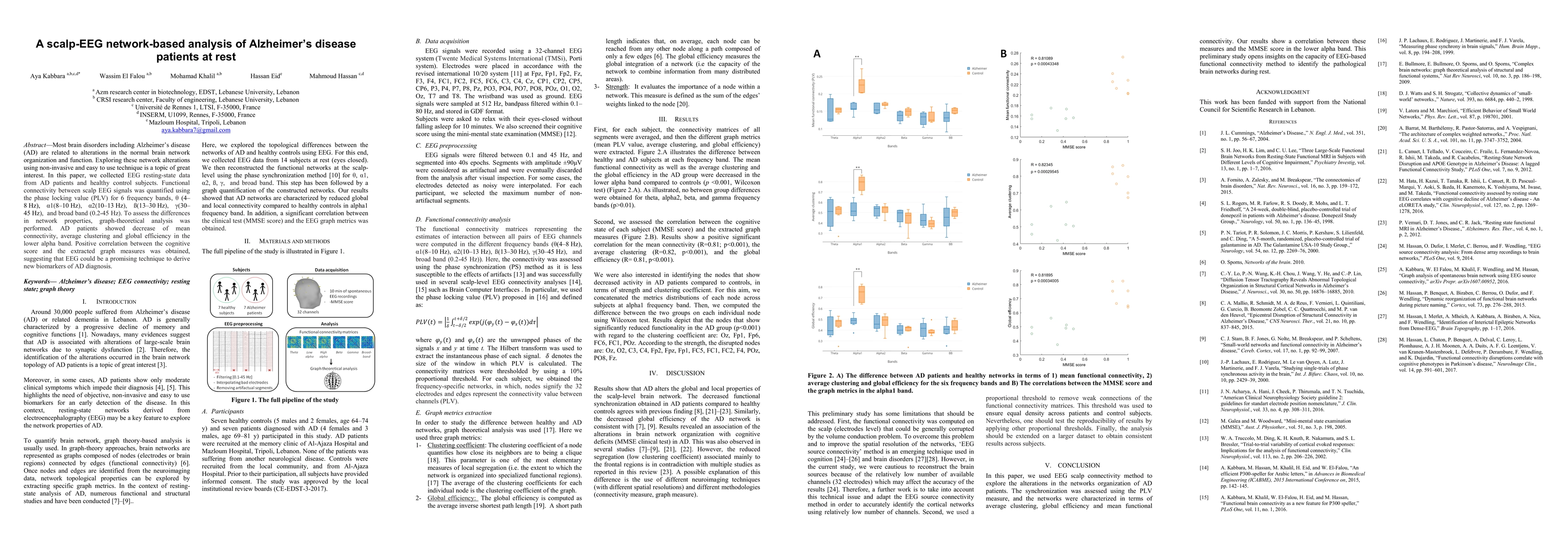 This study investigates Alzheimer's disease (AD) patients using scalp-EEG at rest to identify network alterations through phase locking value (PLV) in six frequency bands. Graph-theoretical analysis reveals decreased connectivity and efficiency in AD patients, indicating EEG as a potential biomarker for AD diagnosis.