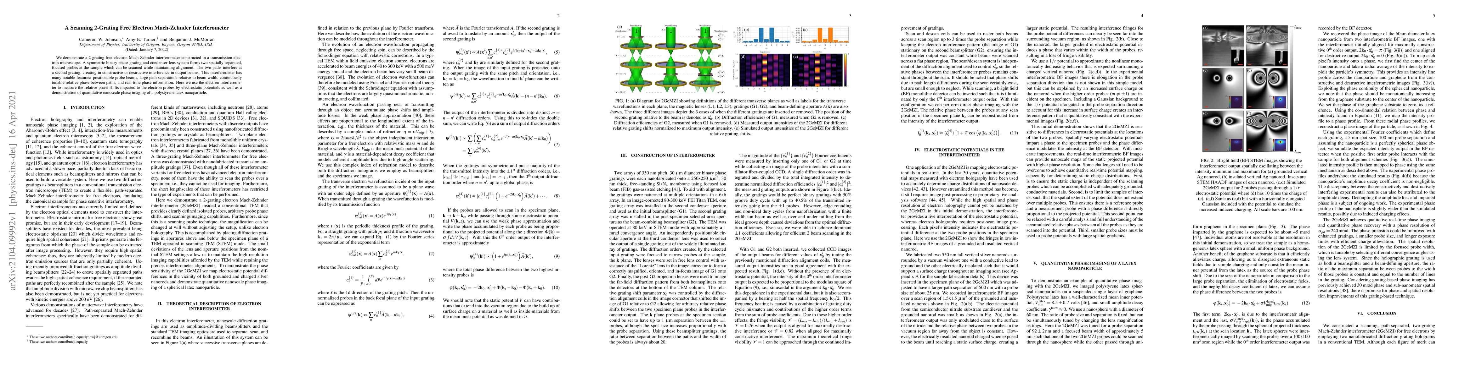 The paper presents a 2-grating free electron Mach-Zehnder interferometer within a transmission electron microscope, showcasing real-time phase information, tunable relative phase, and nanoscale phase imaging capability. The interferometer measures phase shifts from electrostatic potentials and demonstrates imaging of a polystyrene latex nanoparticle.