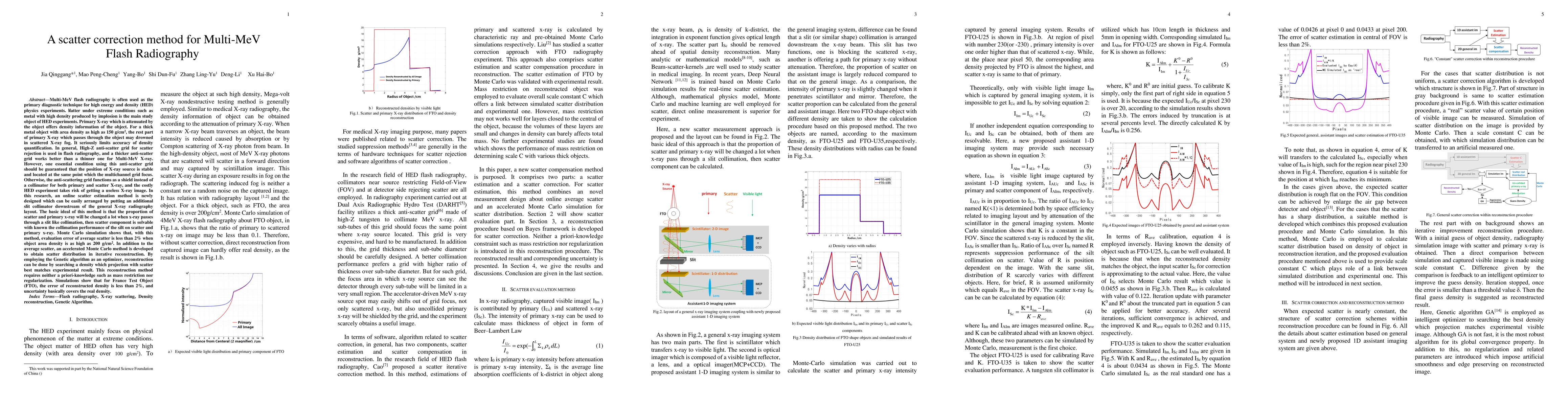 Multi-MeV flash radiography is often used as the primary diagnostic technique for high energy and density (HED) physics experiments. Primary X-ray which is attenuated by the object offers density information of the object. For a thick metal object with area density as high as 150 g/cm2, the rest part of primary X-ray which passes through the object may drowned in scattered X-ray fog. It seriously limits accuracy of density quantification. In this research, an online scatter estimation method is newly designed which can be easily arranged by putting an additional slit collimator downstream of the general X-ray radiography layout. The basic ideal of this method is that the proportion of scatter and primary x-ray will be changed a lot when x-ray passes through a slit like collimation, then scatter component is solvable with known the collimation performance of the silt on scatter and primary x-ray. Monte Carlo simulation shows that, with this method, evaluation error of average scatter is less than 2% when object area density is as high as 200 g/cm2. In addition to the average scatter, an accelerated Monte Carlo method is developed to obtain scatter distribution in iterative reconstruction. By employing the Genetic algorithm as an optimizer, reconstruction can be done by searching a density which projection with scatter best matches experimental result. This reconstruction method requires neither a priori-knowledge such as mass restriction nor regularization. Simulations show that for France Test Object (FTO), the error of reconstructed density is less than 2%, and uncertainty basically covers the real density.