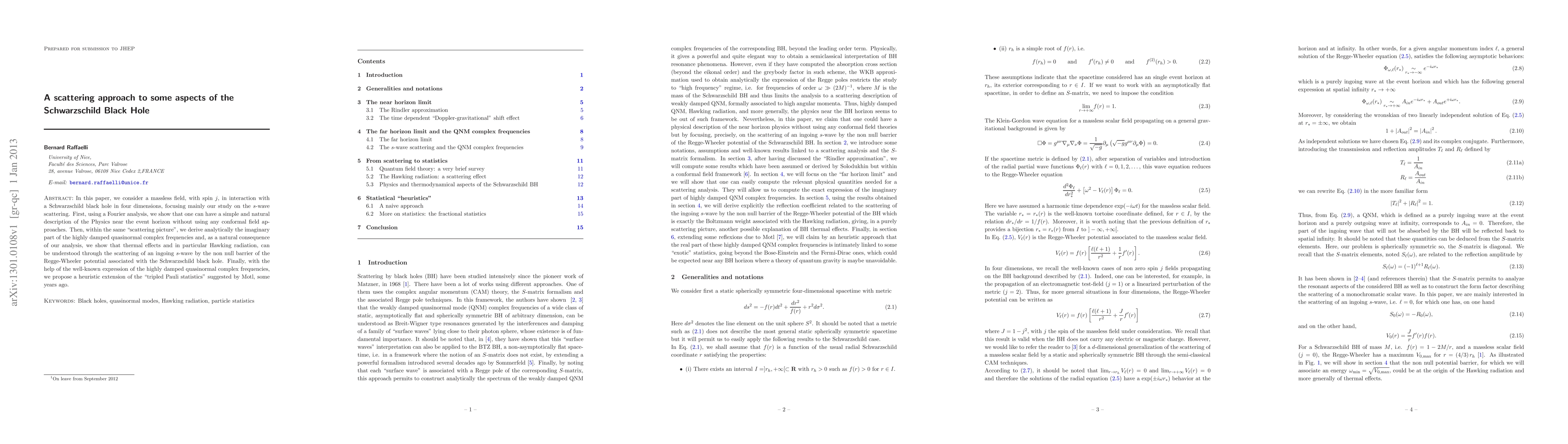 In this paper, we consider a massless field, with spin j, in interaction with a Schwarzschild black hole in four dimensions, focusing mainly our study on the s-wave scattering. First, using a Fourier analysis, we show that one can have a simple and natural description of the Physics near the event horizon without using any conformal field approaches. Then, within the same "scattering picture", we derive analytically the imaginary part of the highly damped quasinormal complex frequencies and, as a natural consequence of our analysis, we show that thermal effects and in particular Hawking radiation, can be understood through the scattering of an ingoing s-wave by the non null barrier of the Regge-Wheeler potential associated with the Schwarzschild black hole. Finally, with the help of the well-known expression of the highly damped quasinormal complex frequencies, we propose a heuristic extension of the "tripled Pauli statistics" suggested by Motl, some years ago.