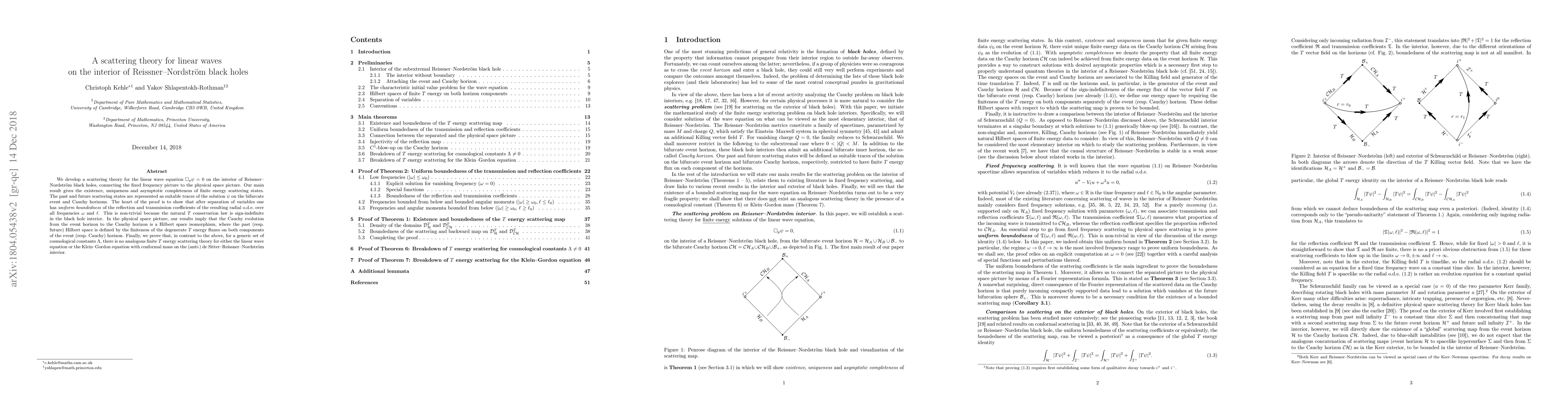 This paper develops a scattering theory for linear waves inside Reissner-Nordström black holes, proving the existence and uniqueness of finite energy scattering states. The key result shows uniform boundedness of reflection and transmission coefficients, establishing a Hilbert space isomorphism for Cauchy evolution.