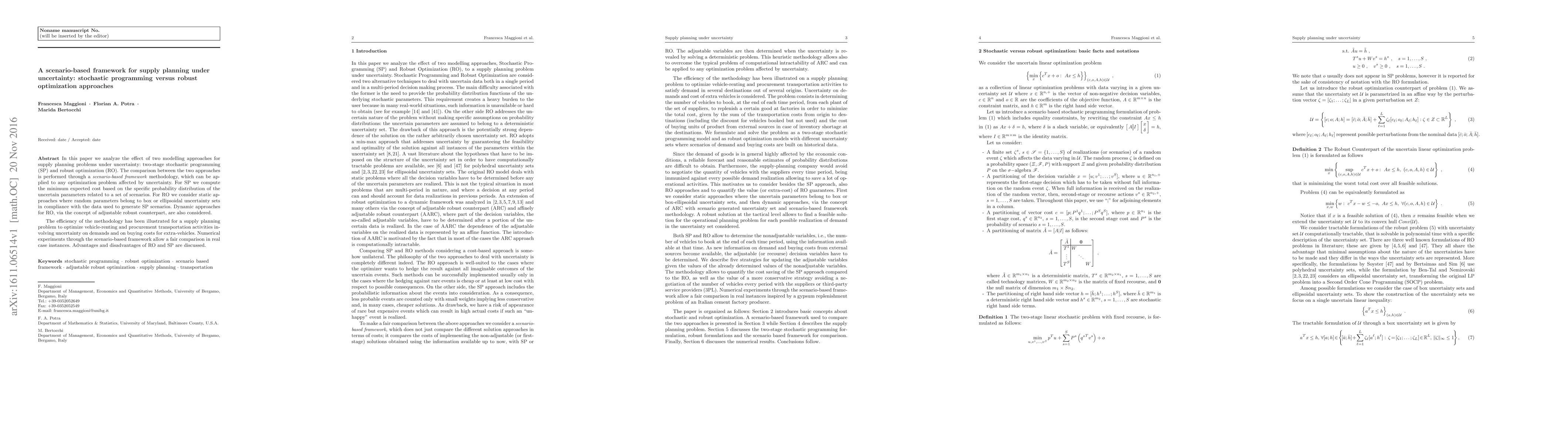 In this paper we analyze the effect of two modelling approaches for supply planning problems under uncertainty: two-stage stochastic programming (SP) and robust optimization (RO). The comparison between the two approaches is performed through a scenario-based framework methodology, which can be applied to any optimization problem affected by uncertainty. For SP we compute the minimum expected cost based on the specific probability distribution of the uncertain parameters related to a set of scenarios. For RO we consider static approaches where random parameters belong to box or ellipsoidal uncertainty sets in compliance with the data used to generate SP scenarios. Dynamic approaches for RO, via the concept of adjustable robust counterpart, are also considered. The efficiency of the methodology has been illustrated for a supply planning problem to optimize vehicle-renting and procurement transportation activities involving uncertainty on demands and on buying costs for extra-vehicles. Numerical experiments through the scenario-based framework allow a fair comparison in real case instances. Advantages and disadvantages of RO and SP are discussed.