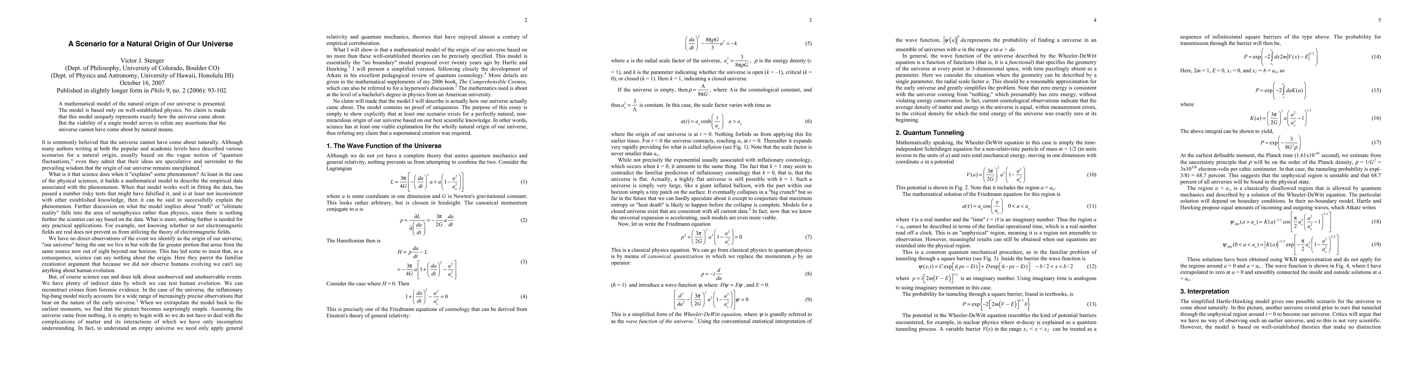 A mathematical model of the natural origin of our universe is presented. The model is based only on well-established physics. No claim is made that this model uniquely represents exactly how the universe came about. But the viability of a single model serves to refute any assertions that the universe cannot have come about by natural means.