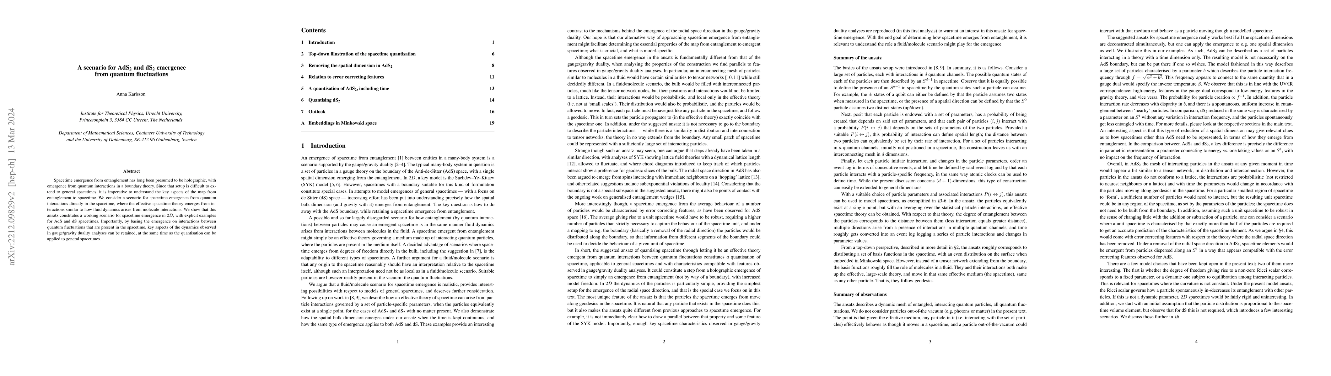 Spacetime emergence from entanglement has long been presumed to be holographic, with emergence from quantum interactions in a boundary theory. Since that setup is difficult to extend to general spacetimes, it is imperative to understand the key aspects of the map from entanglement to spacetime. We consider a scenario for spacetime emergence from quantum interactions directly in the spacetime, where the effective spacetime theory emerges from interactions similar to how fluid dynamics arises from molecule interactions. We show that this ansatz constitutes a working scenario for spacetime emergence in 2D, with explicit examples for AdS and dS spacetimes. Importantly, by basing the emergence on interactions between quantum fluctuations that are present in the spacetime, key aspects of the dynamics observed in gauge/gravity duality analyses can be retained, at the same time as the quantisation can be applied to general spacetimes.