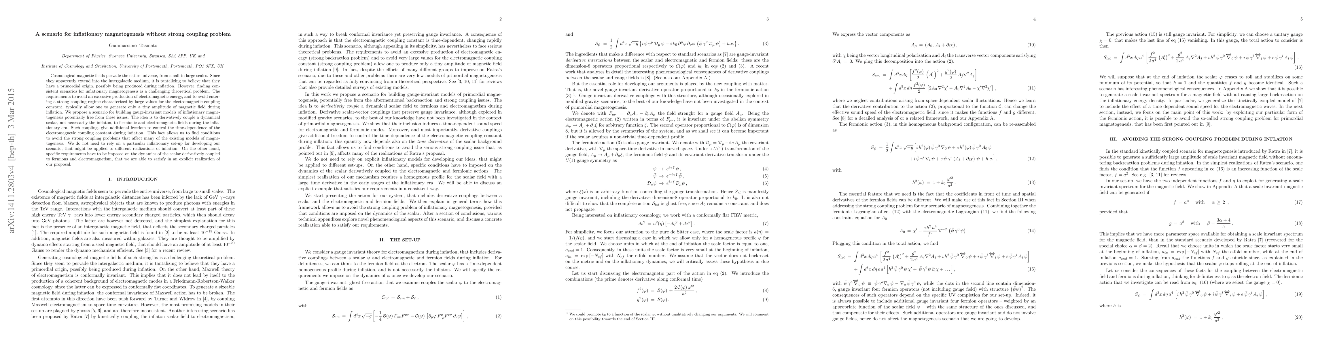 Cosmological magnetic fields pervade the entire universe, from small to large scales. Since they apparently extend into the intergalactic medium, it is tantalizing to believe that they have a primordial origin, possibly being produced during inflation. However, finding consistent scenarios for inflationary magnetogenesis is a challenging theoretical problem. The requirements to avoid an excessive production of electromagnetic energy, and to avoid entering a strong coupling regime characterized by large values for the electromagnetic coupling constant, typically allow one to generate only a tiny amplitude of magnetic field during inflation. We propose a scenario for building gauge-invariant models of inflationary magnetogenesis potentially free from these issues. The idea is to derivatively couple a dynamical scalar, not necessarily the inflaton, to fermionic and electromagnetic fields during the inflationary era. Such couplings give additional freedom to control the time-dependence of the electromagnetic coupling constant during inflation. This fact allows us to find conditions to avoid the strong coupling problems that affect many of the existing models of magnetogenesis. We do not need to rely on a particular inflationary set-up for developing our scenario, that might be applied to different realizations of inflation. On the other hand, specific requirements have to be imposed on the dynamics of the scalar derivatively coupled to fermions and electromagnetism, that we are able to satisfy in an explicit realization of our proposal.