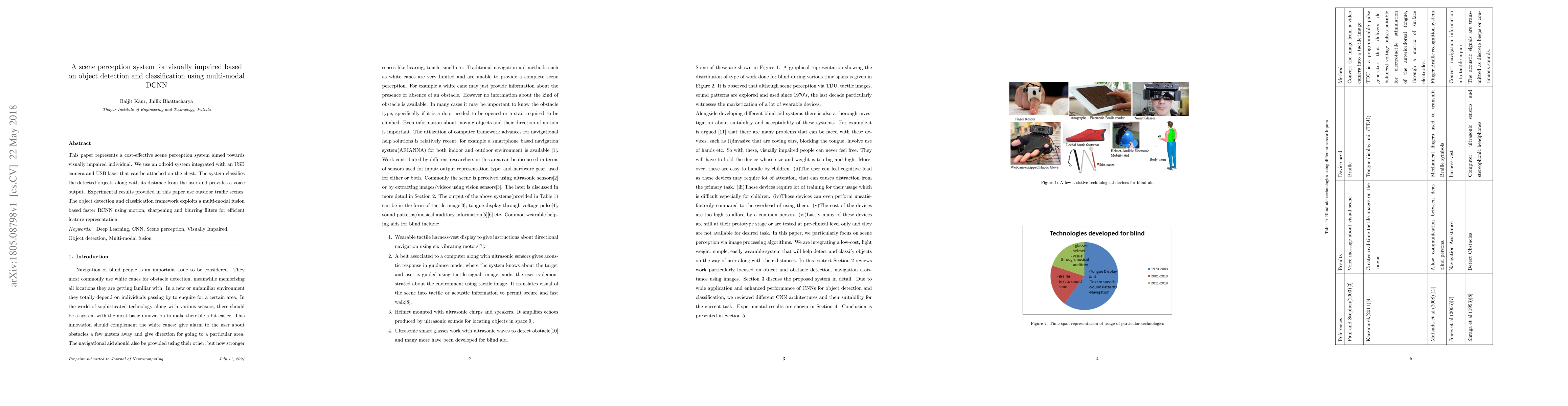 This paper proposes a cost-effective scene perception system for visually impaired individuals, utilizing a multi-modal DCNN with an Odroid system, USB camera, and laser, to detect and classify objects and provide distance information via voice output. Experimental results demonstrate its effectiveness in outdoor traffic scenes.