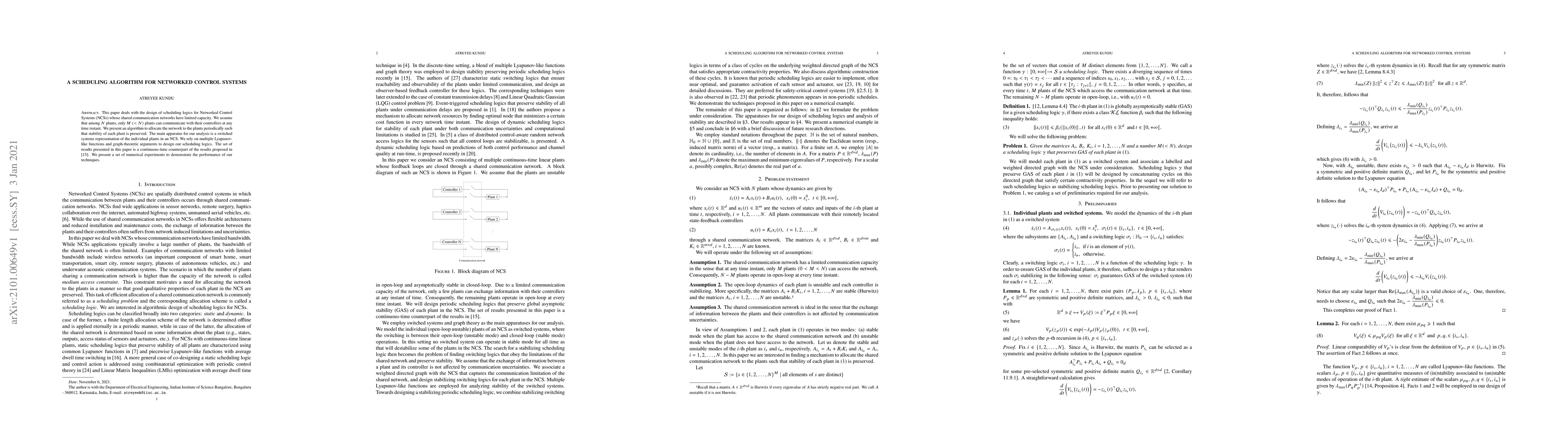 This paper proposes a scheduling algorithm for Networked Control Systems (NCSs) with limited communication network capacity, ensuring stability by periodically allocating network resources to a subset of \(M\) plants out of \(N\). The algorithm employs switched systems and multiple Lyapunov-like functions, validated through numerical experiments.